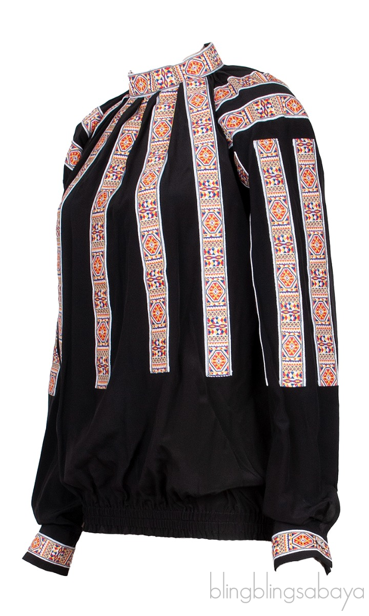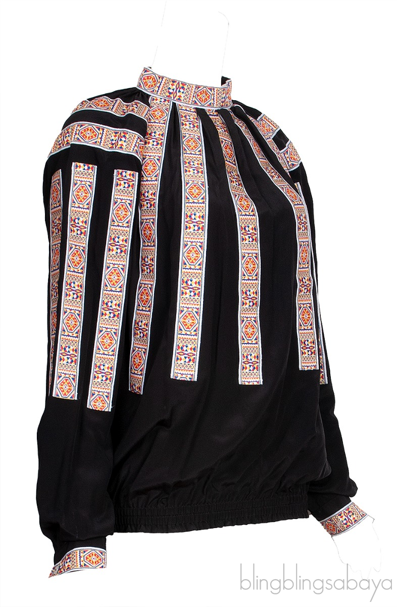 This Black Embroidered Top from Stella jean is crafted from 100% Silk in black. This blouse features high neckline, long sleeves with button cuffs, multicolor embroiderey design and elastic hemline.