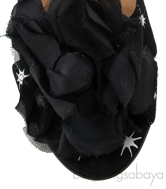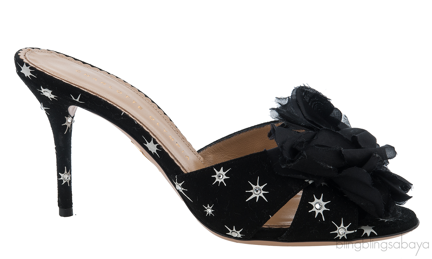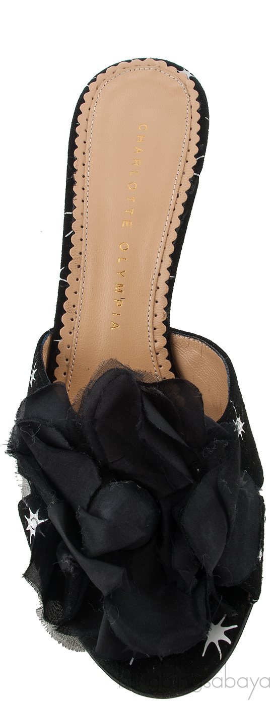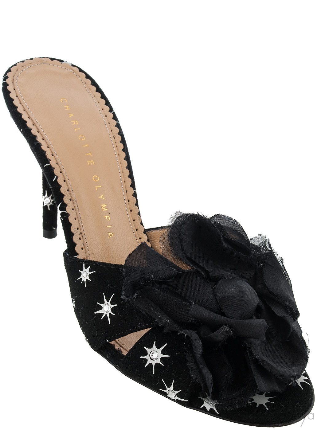 These Black Floral Crystal Mule Sandals from Charlotte Olympia are crafted in black suede leather with beige leather lining. This cute sandals features a criss-cross vamp decorated with black floral lace, white star printing accented with swarovski crystals, covered heels measuring 90 mm high and metallic spider-web logo2 in gold at sole.