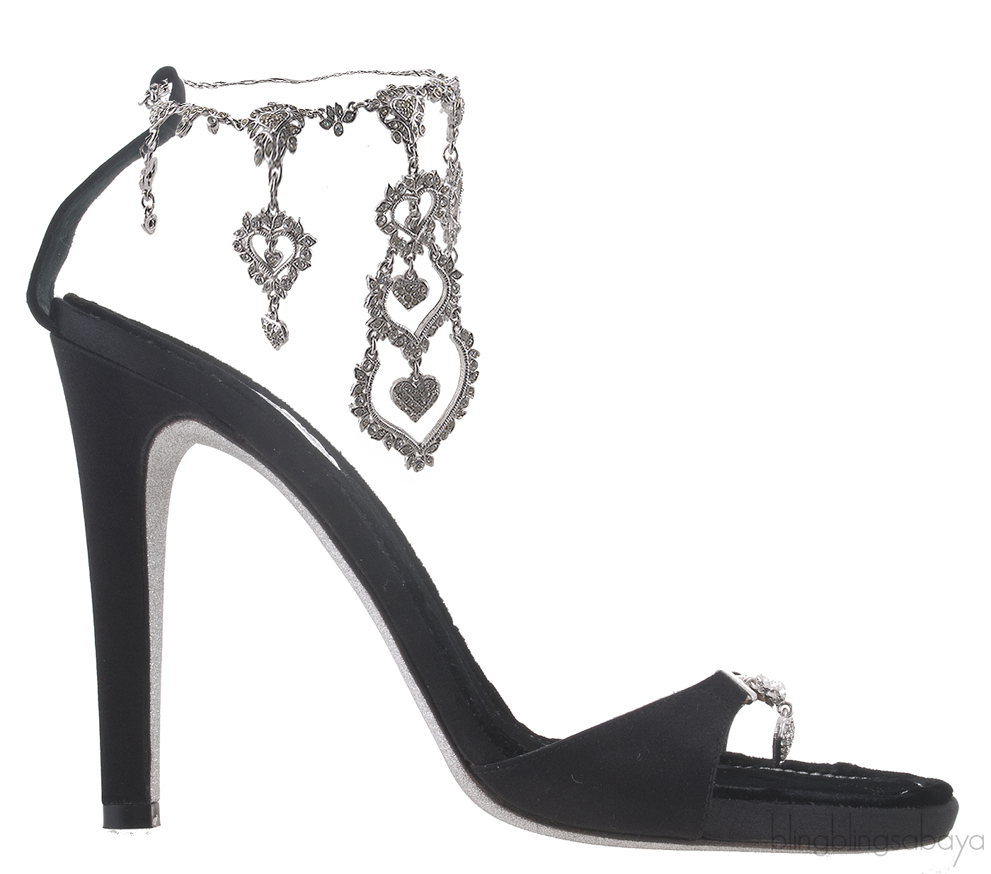 These Black Heart Chain Strap Sandals from Rene Caovilla are crafted in black satin upper with black leather lining. These stunning pair features a black satin vamp with silver chains decorated with crystals and heart charm. It also comes with detachable silver anklet design with asymmetrical heart fastened on a lobster closure, suede leather insole, covered heels measuring 110 mm high and silver glittery sole.