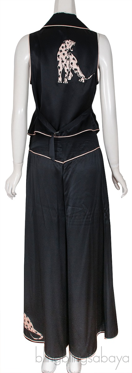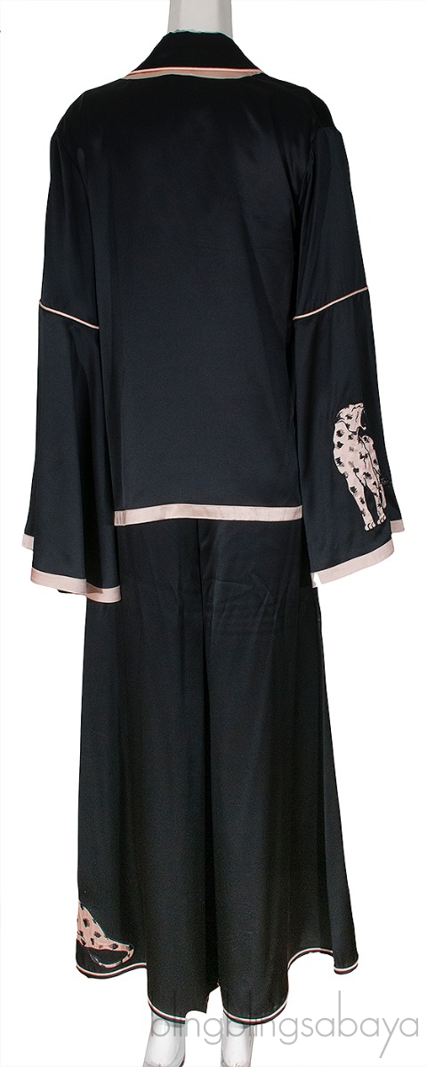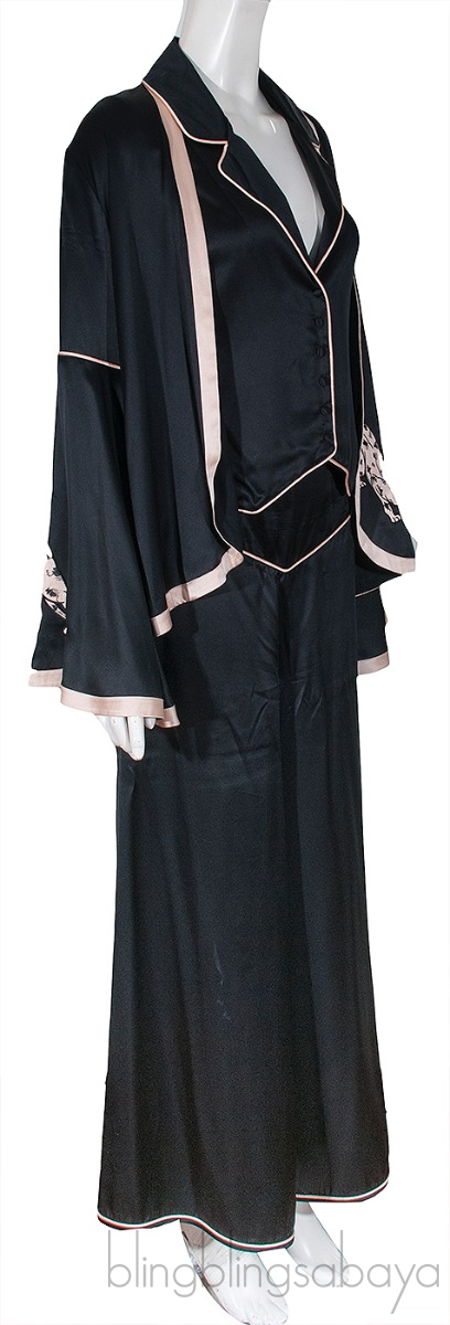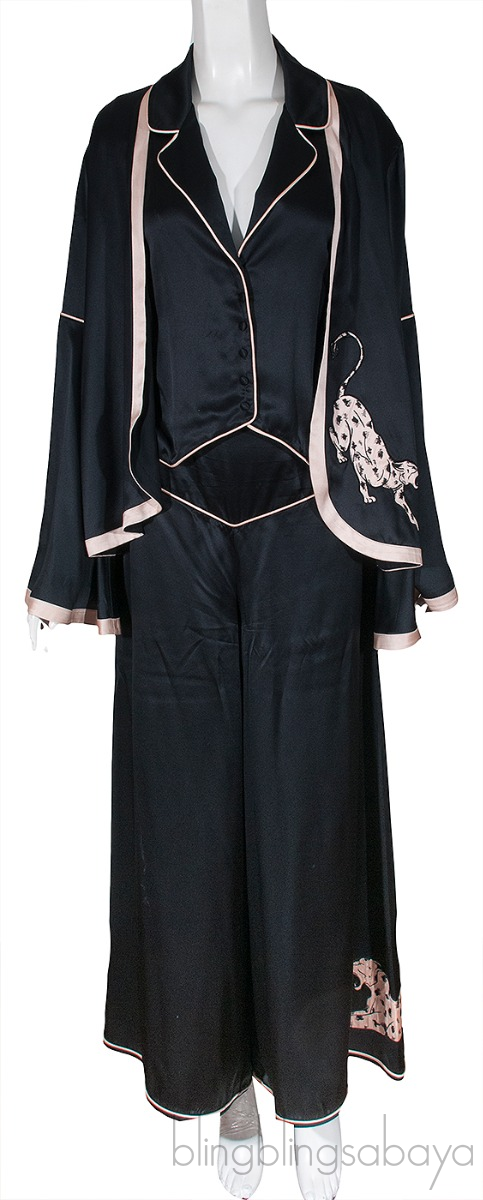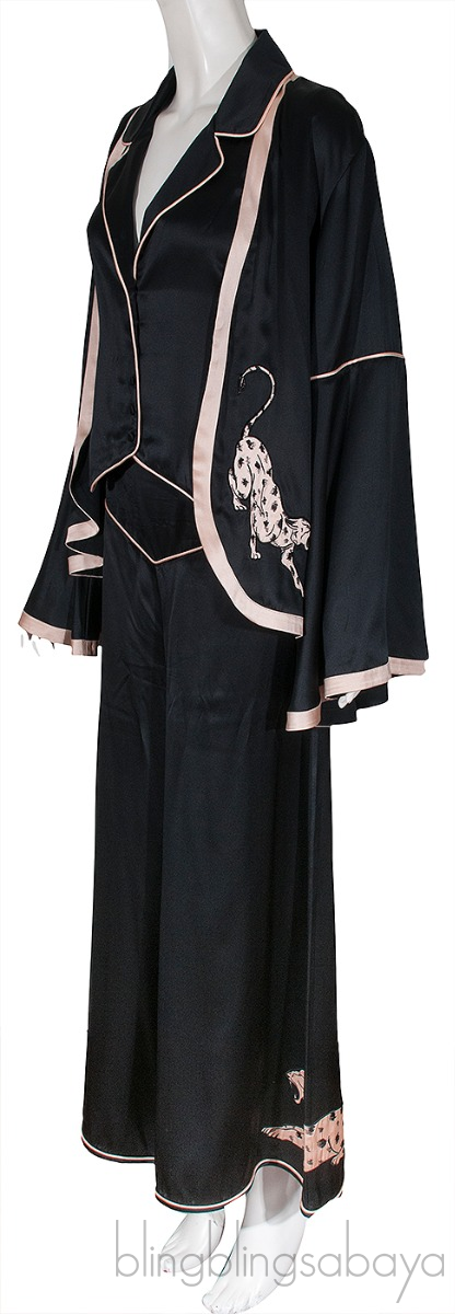 These Black Jacket , Blazer & Pajama Set from Agent Provocateur are crafted from 100% Silk fabric in black. Jacket features an open front, long bell sleeves, nude fabric trim and panther motif.