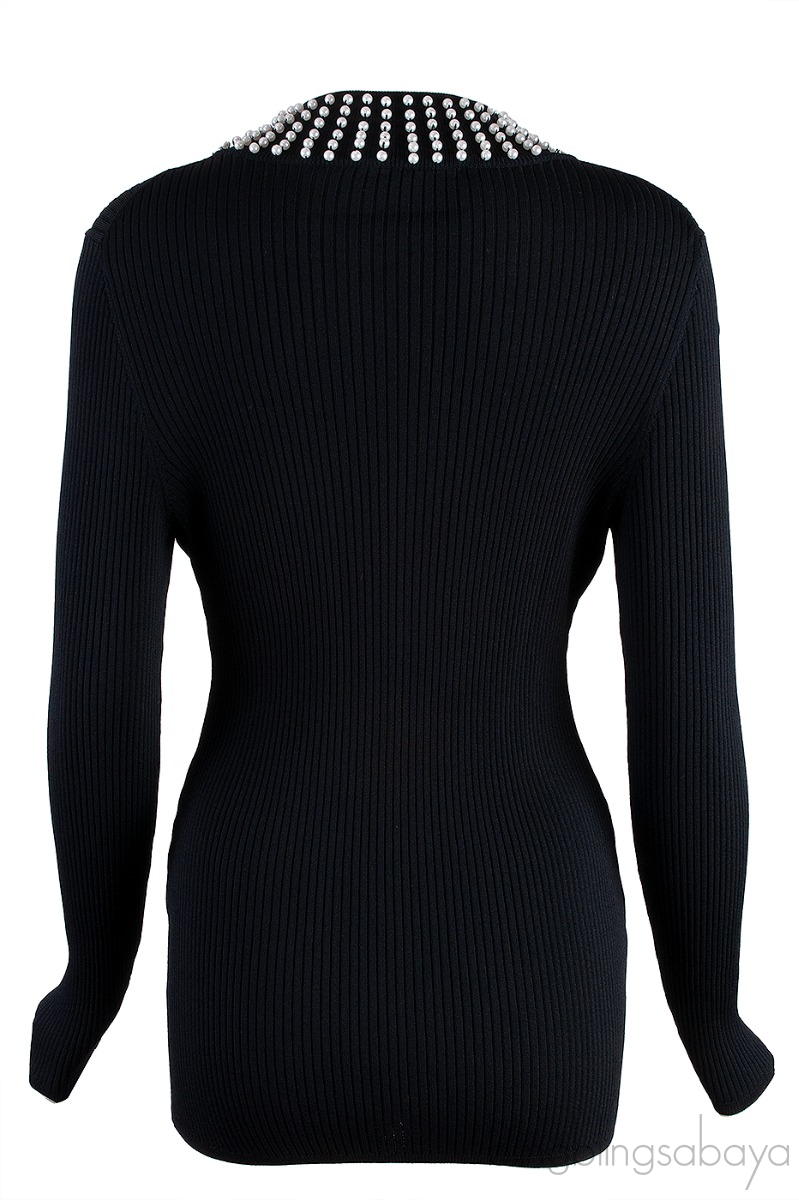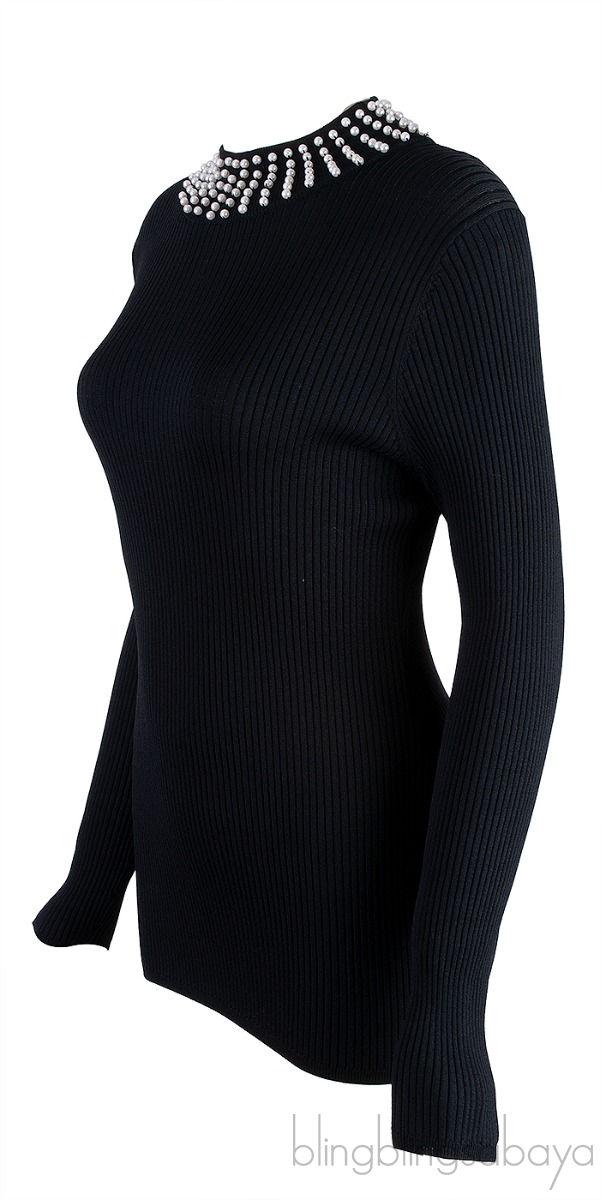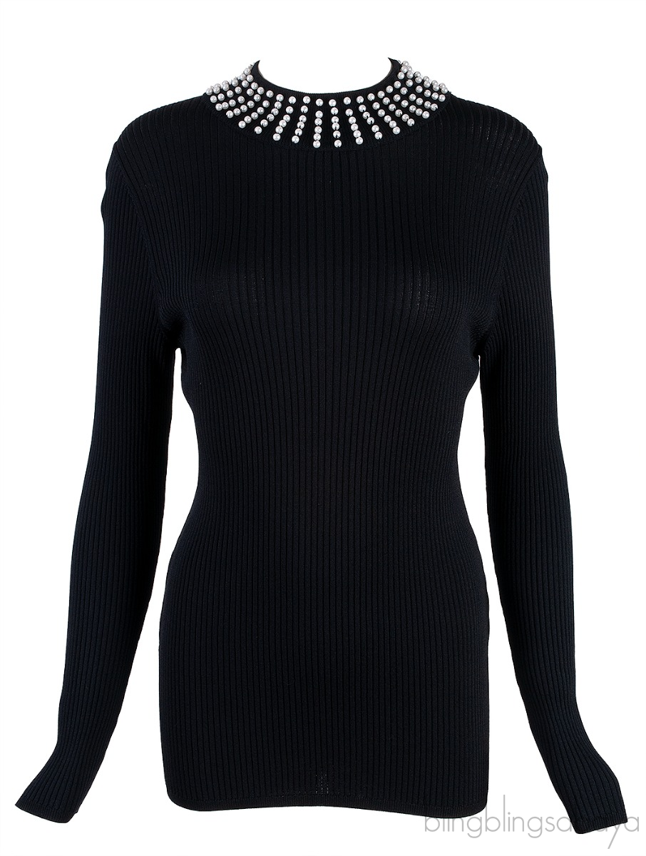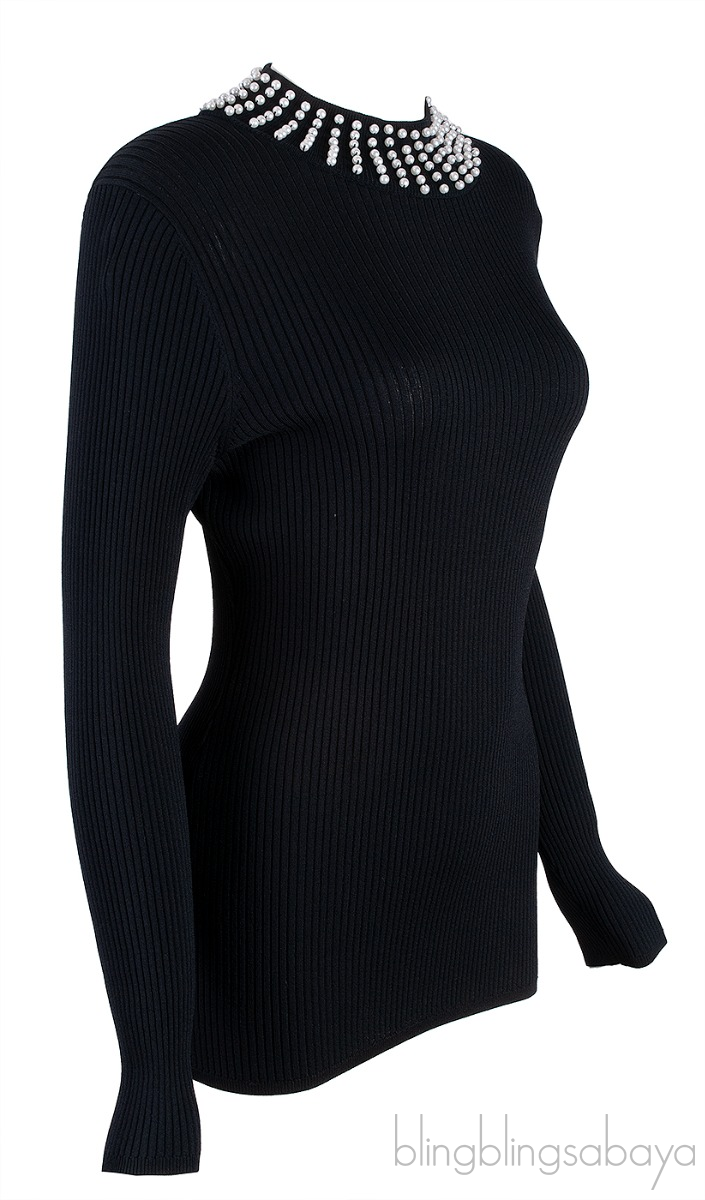 This Black Knitted Pearl Embellished Top from Sandro is crafted from black knitted fabric featuring a mock necklace with white pearl embellishment, long sleeves and pull-over style.