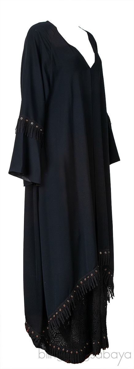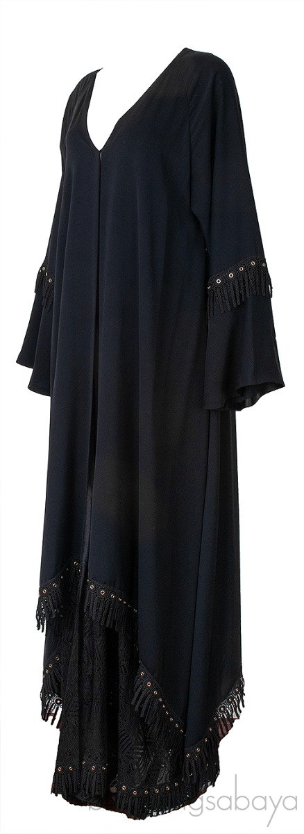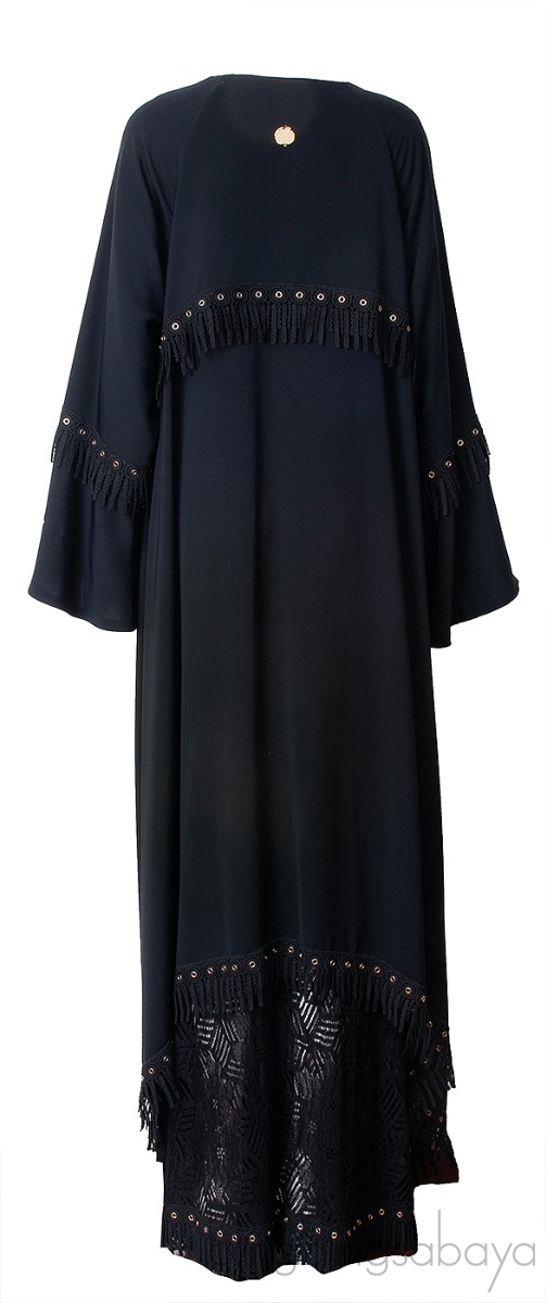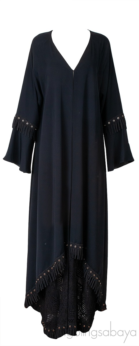 Black Layered Eyelet Ring Fringed Trim Abaya from MAUZAN!
