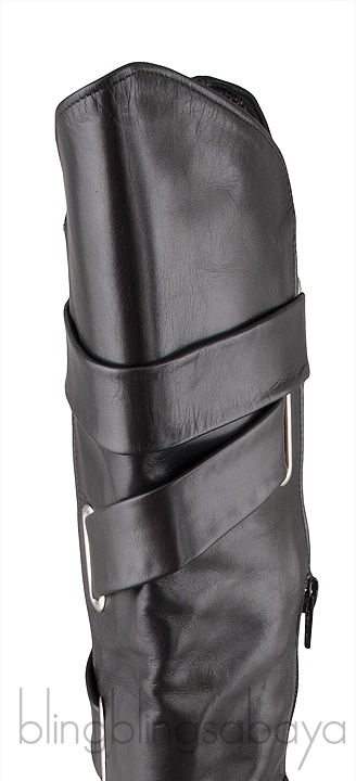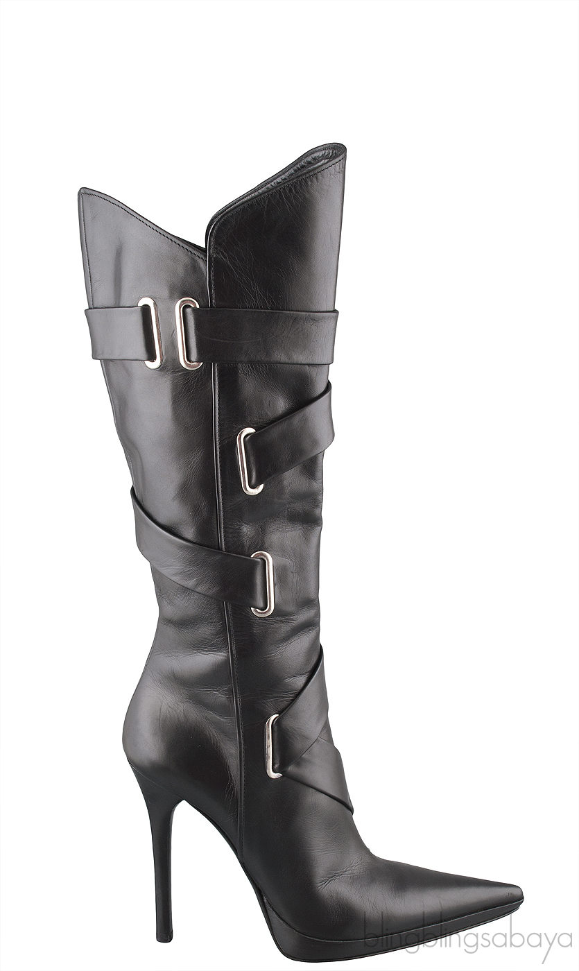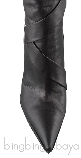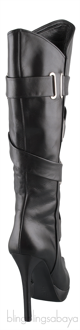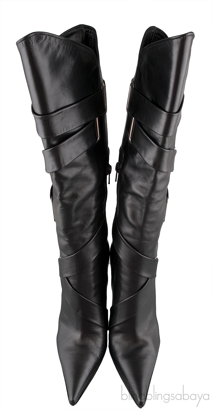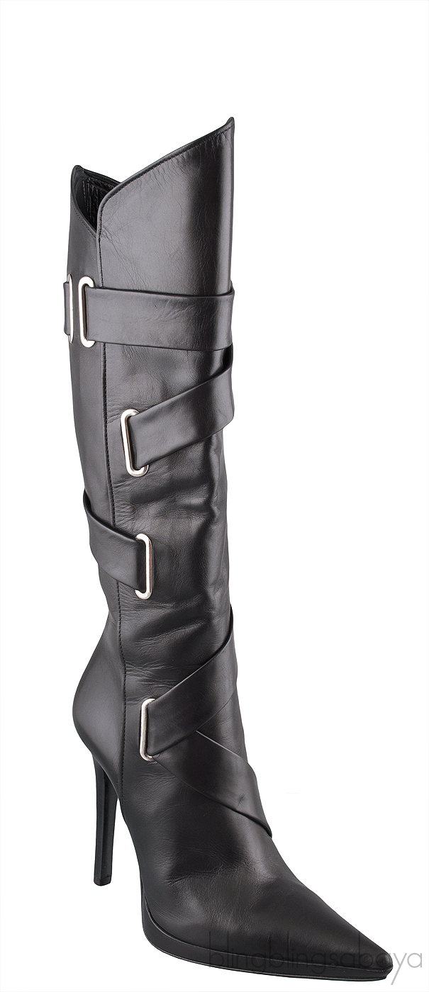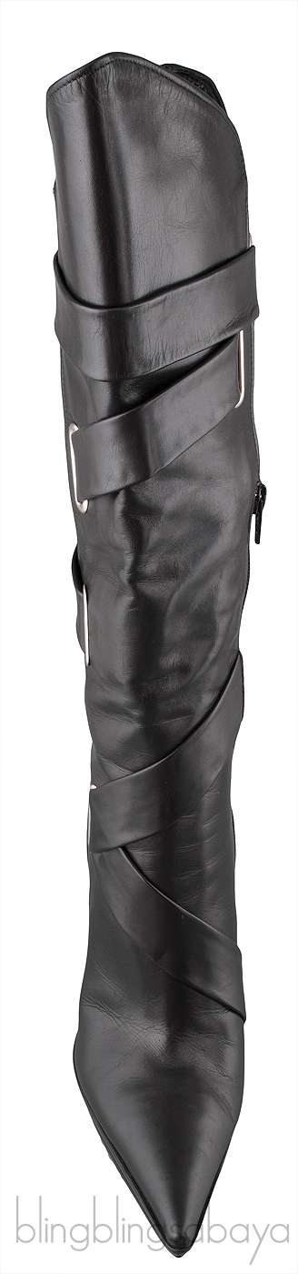 These Black Leather Pointed Toe Boots from Casadei are crafted in black leather upper with coordinating black leather lining. These boots features a pointed toe, below knee length shaft designed with straps and silver metal rectangular buckles, zip fastening on the side, stiletto heels measuring 120 mm high and leather sole.