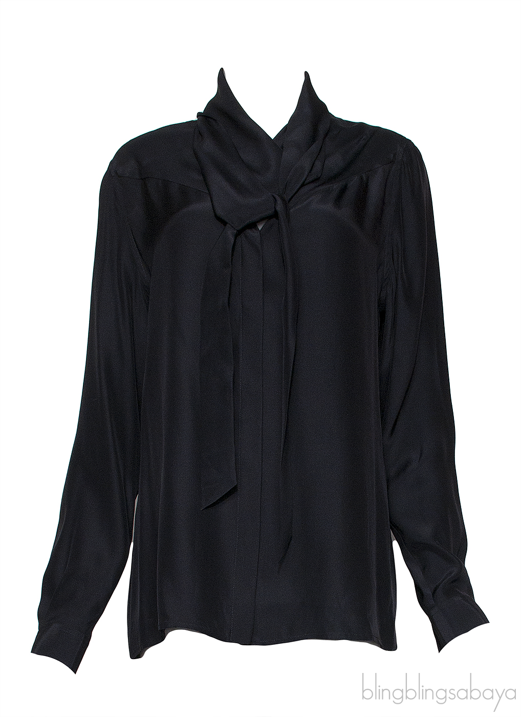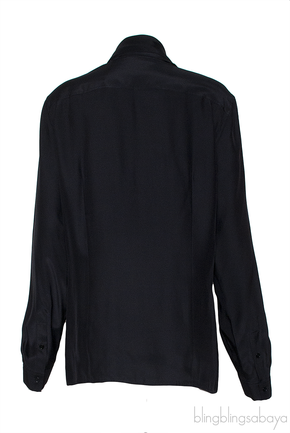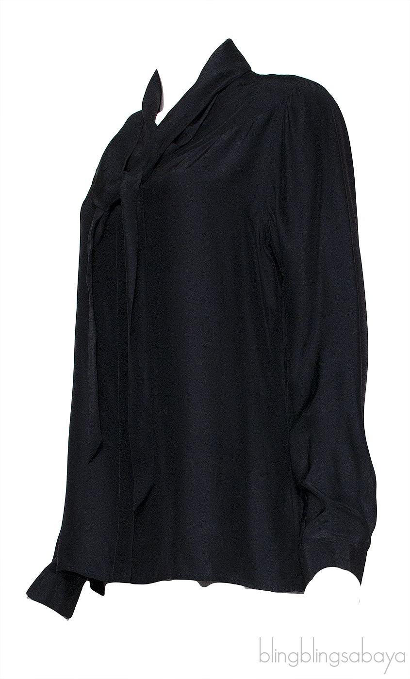 This Black Long sleeves Shirt from Barbara Bui is crafted from 100% Silk fabric n plain black. This shirt features a self-tie at neck, long sleeves with button cuffs, and button fastening through the front.