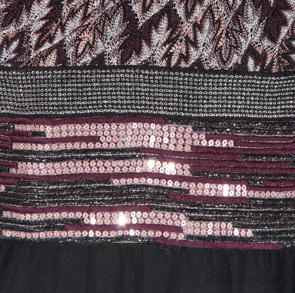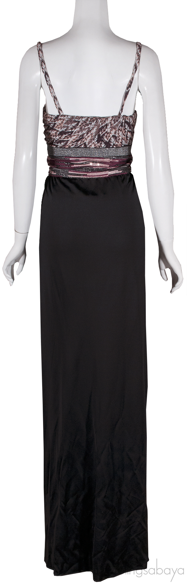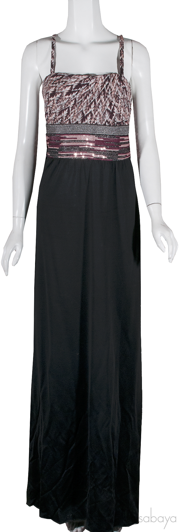 This Black Maxi Dress from Missoni is crafted in 88% Rayon and 12% Nylon featuring a printed knit upper with sequin embellishment, empire waist, sleeveless with detachable straps, zip fastening on the side and black maxi skirt.