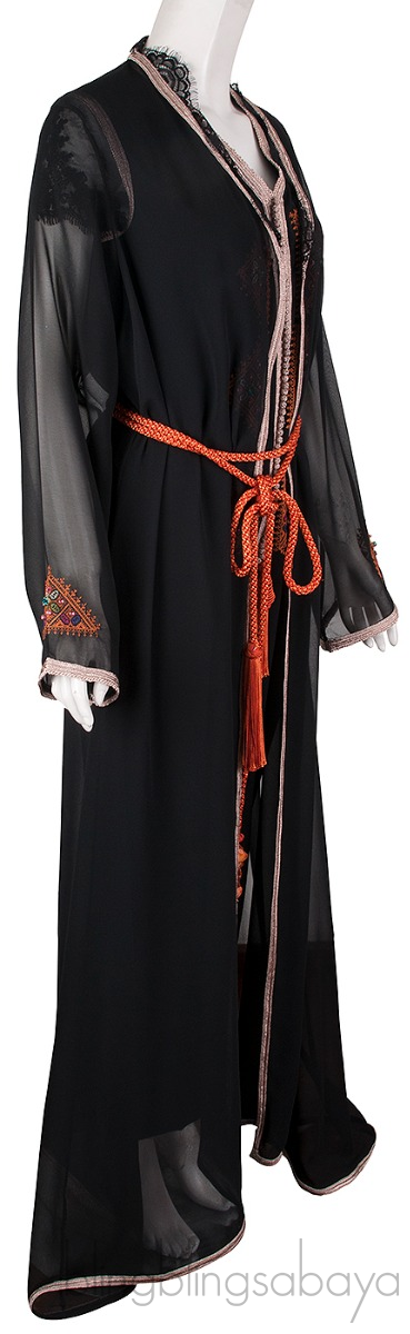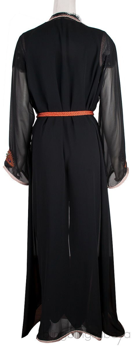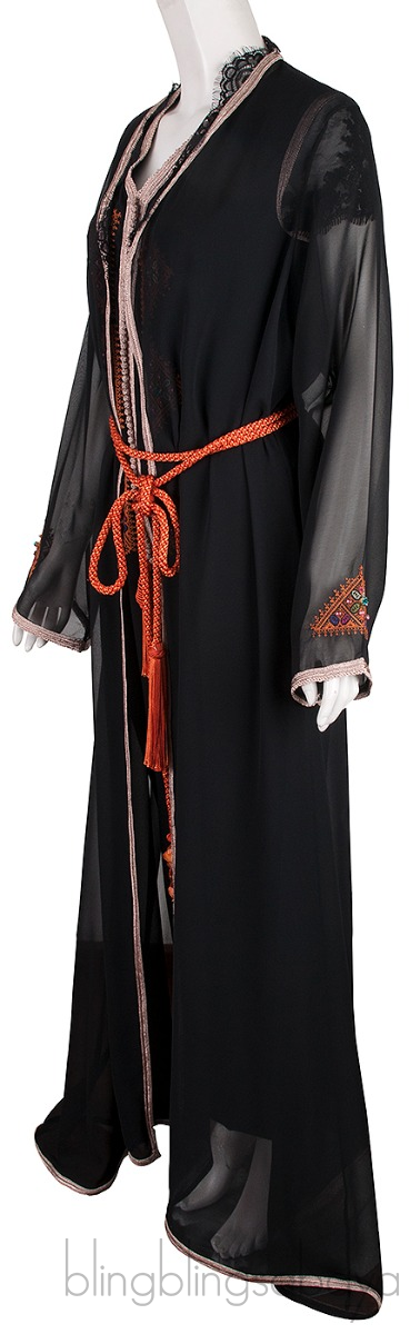 These Black Moroccan Jumpsuit & Cover Up from Musk are crafted from black fabric. Jumsuit features a v-neckline, lace cap sleeves, orange and metallic light gold Moroccan embroidery, crystal embellishment and zip fastening at rear. This Jumpsuit comes with black sheer long sleeves cover up and belt.