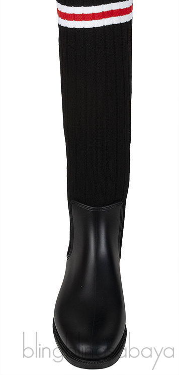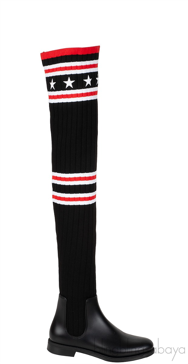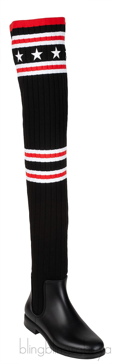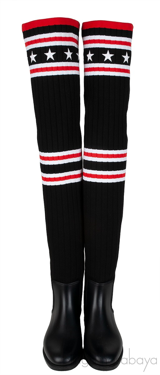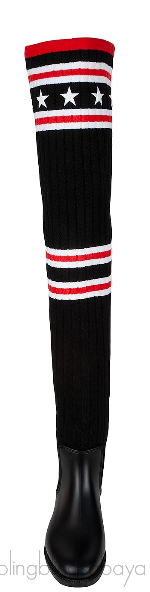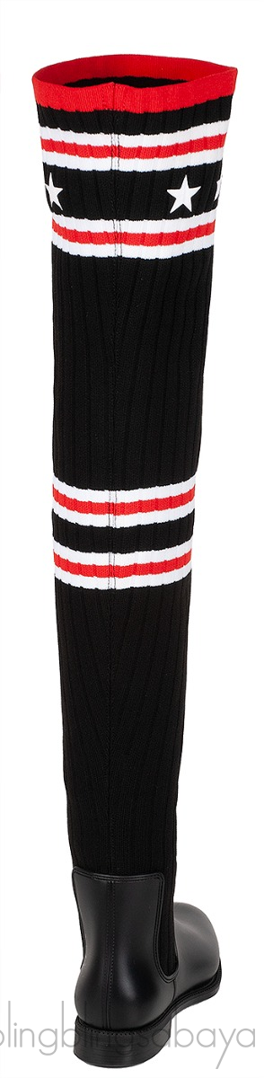 These Black Over the Knee High Knit-sock Boots from Givenchy is crafted from is crafted from black rubber upper with ribbed knit thigh-high socks. These boots features an almond toe, stripes and star print on the knit sock, rubber insole and sole.