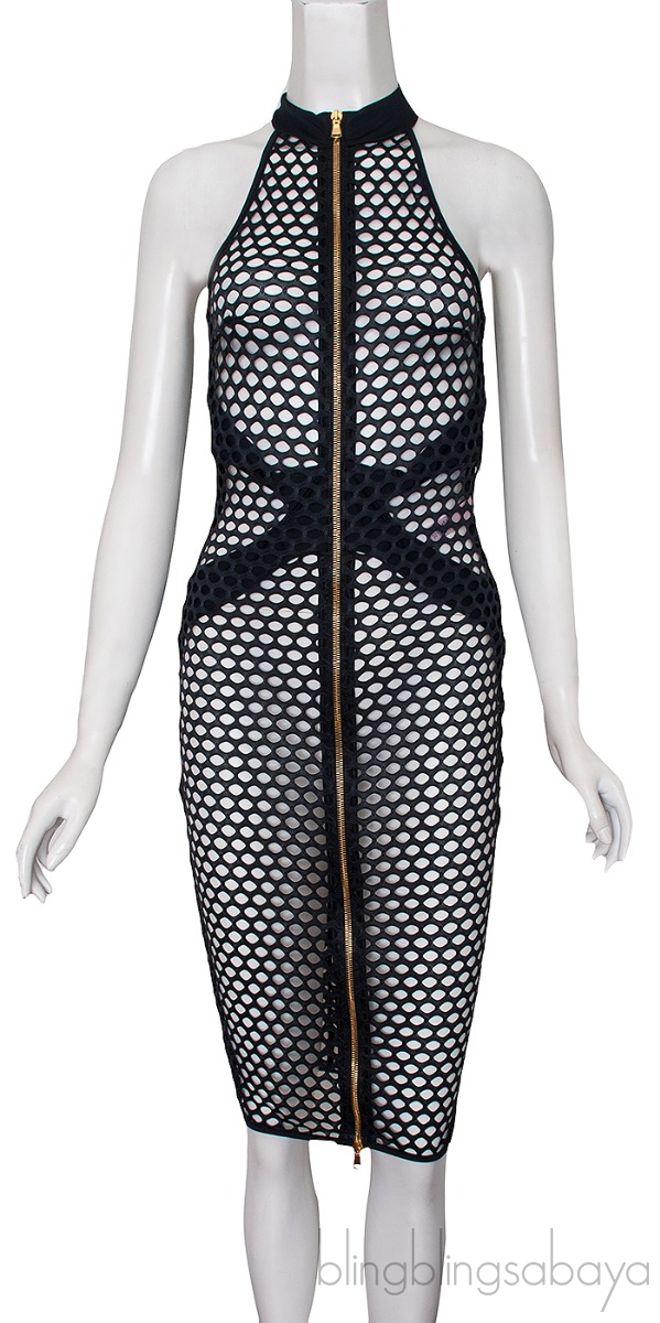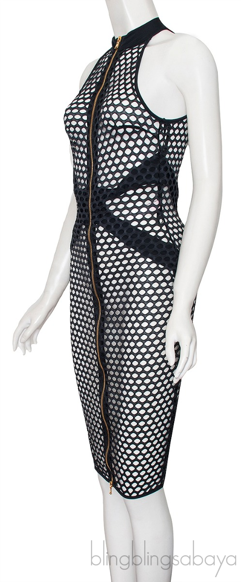 This Black Perforated Dress from Agent Provocateur is crafted from 80% Polyamide and 20% Elastance in black hue. This figure hugging dress features a perforated design, close neckline, sleeveless, knee-length and gold zip fastening to the front.