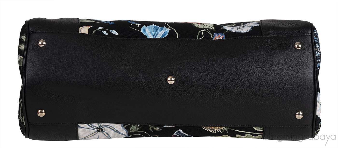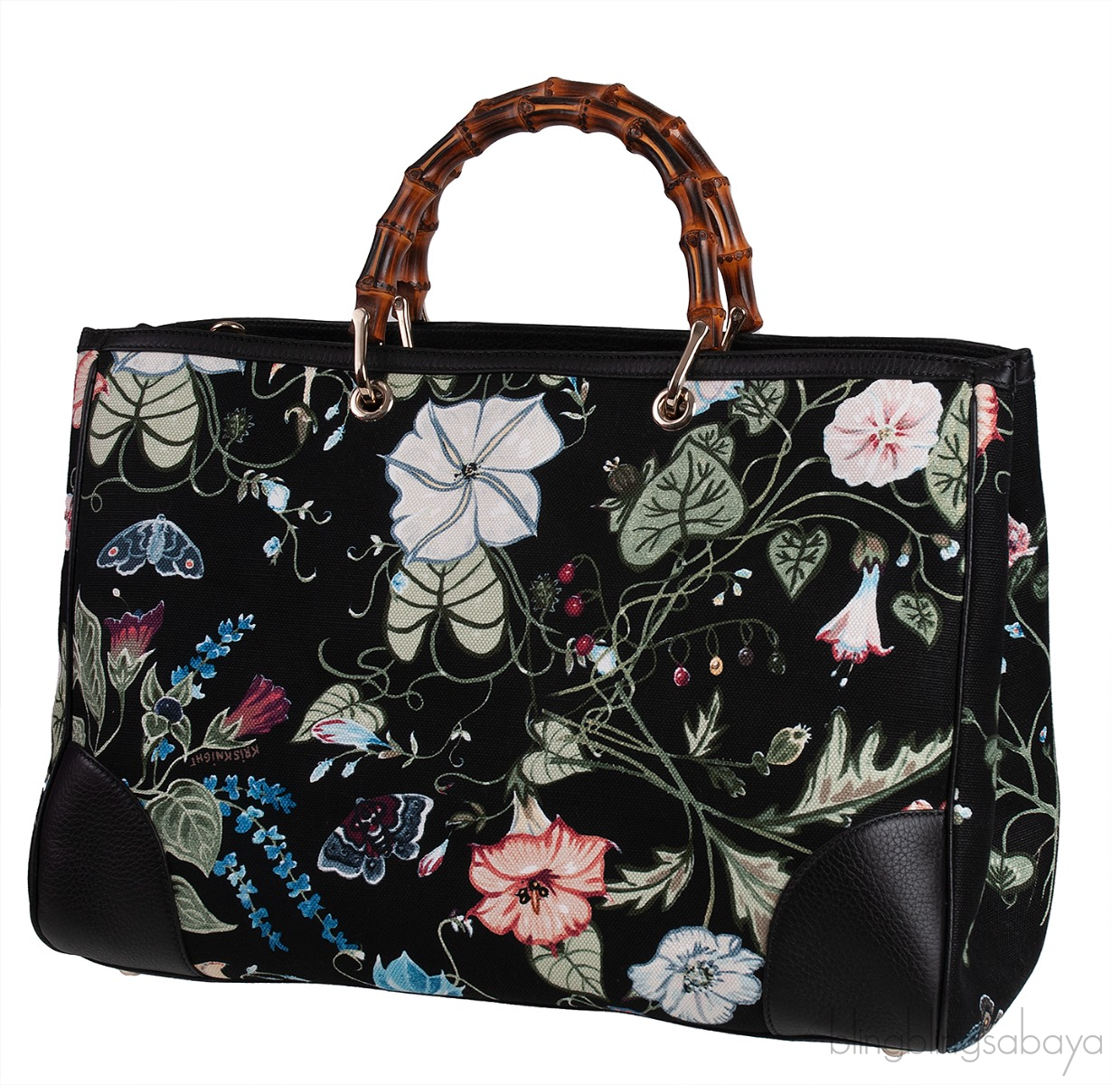 This Black Printed Canvas Bamboo Shopper Tote from Gucci is crafted in black printed canvas and blacl leather accented with the gold hardware. This bag features a floral print canvas and leather trim with two bamboo handles.