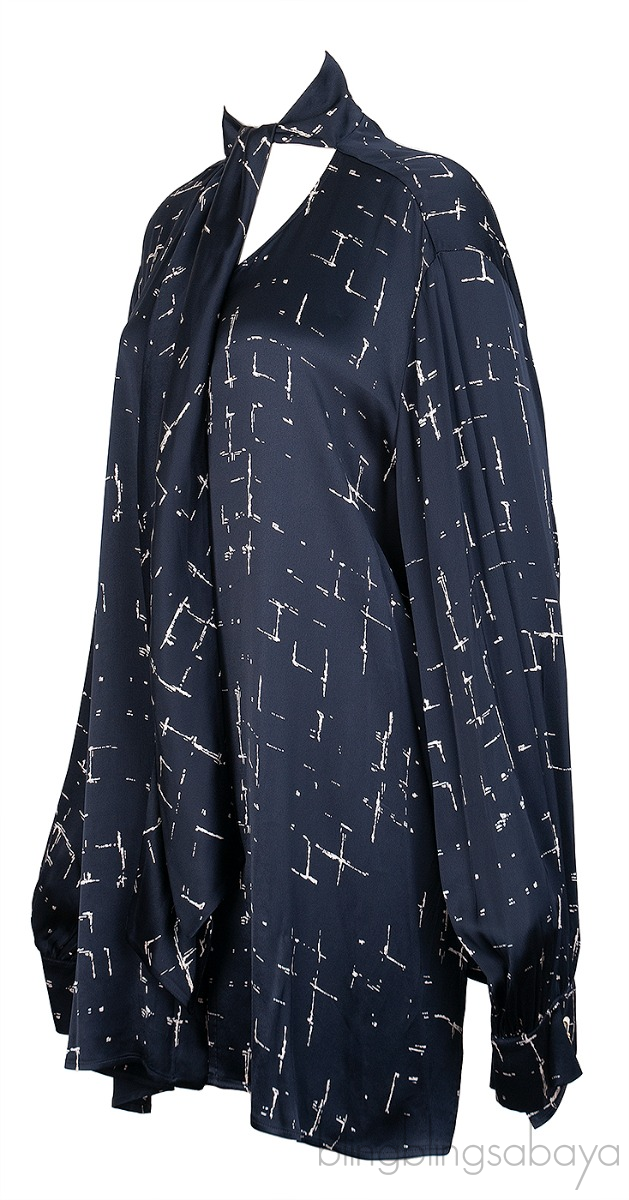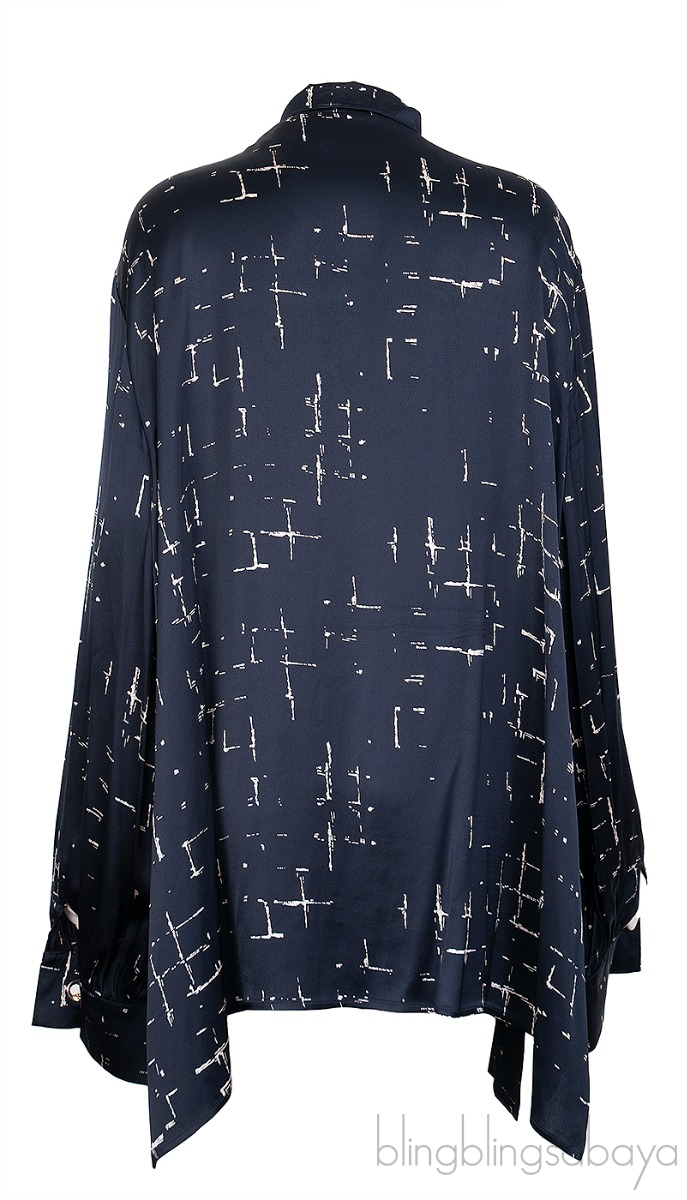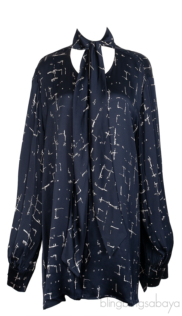 This Black Printed Self-tie Neck Blouse form Marina Rinaldi is crafted in black printed fabric featuring a self-tie neck collar, button fastening through the front, long sleeves with gold metal links at cuffs, side slits at hem.