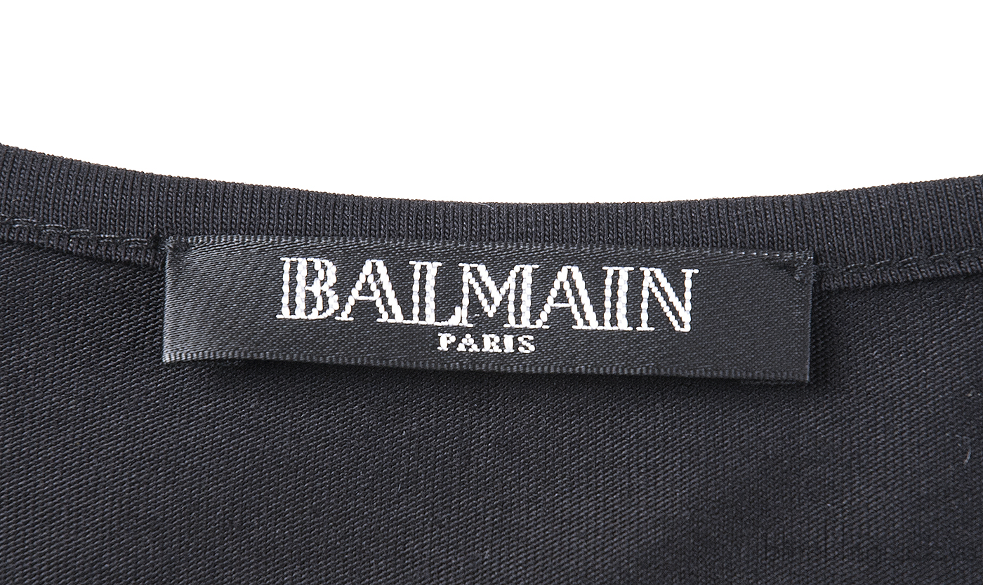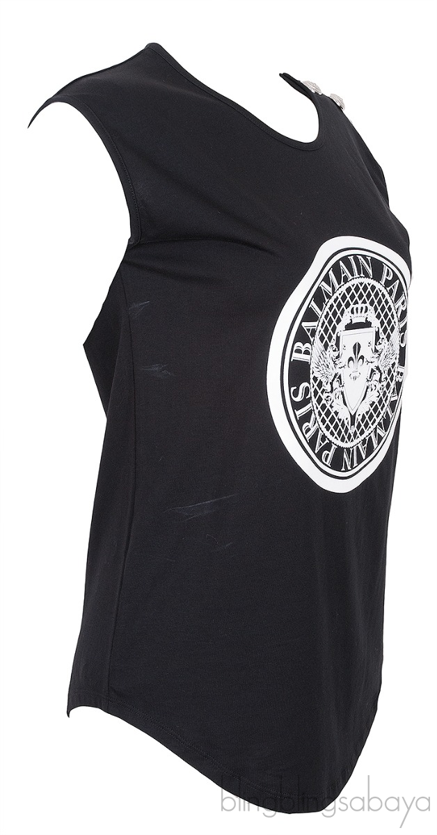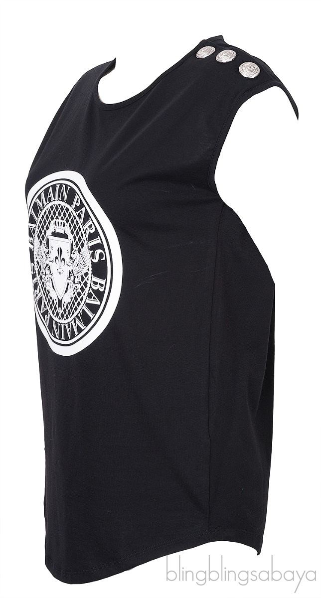 This Black Printed Sleeveless Top from Balmain is crafted from 100% Cotton fabric in black hue. This top features a round neckline, detailed with embossed silver-tone buttons on a single shoulder, print at the front, sleeveless and curved hem.