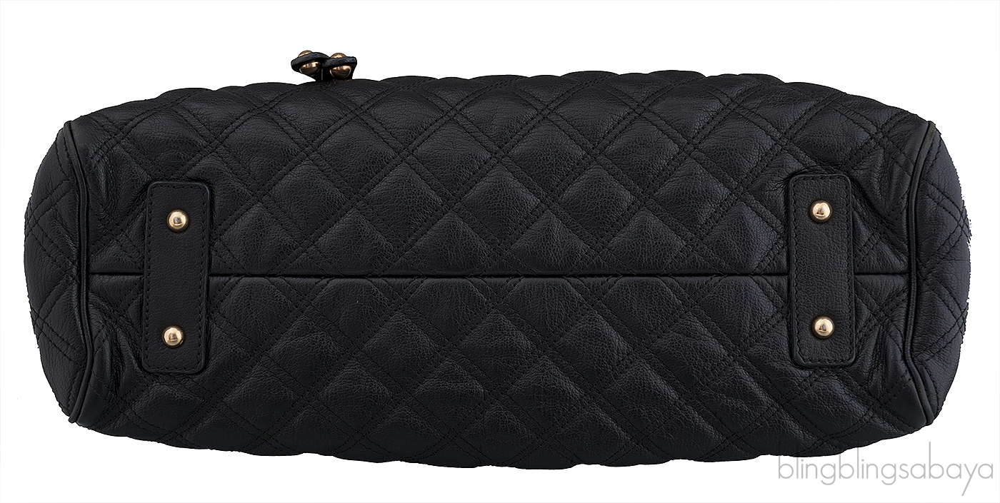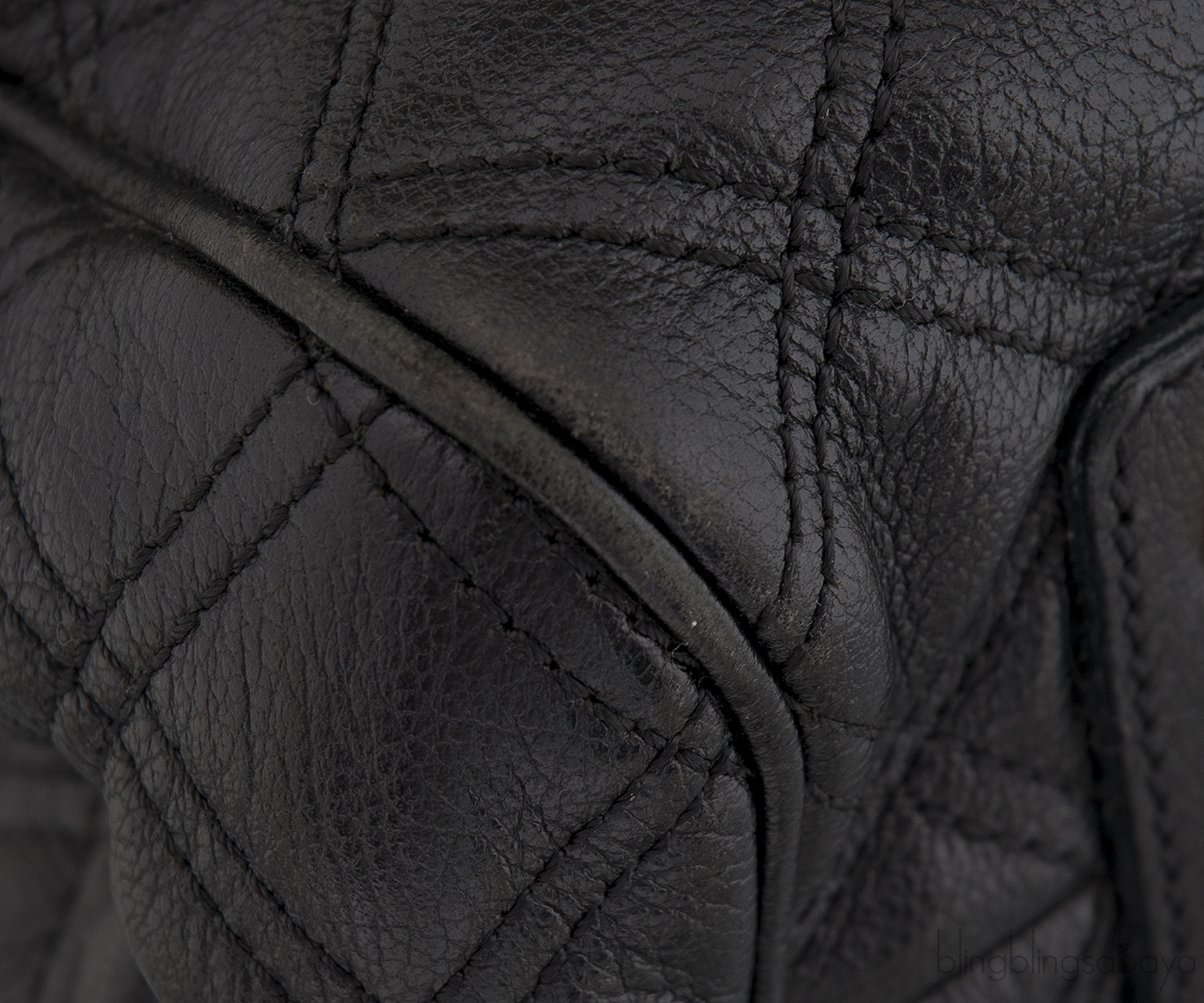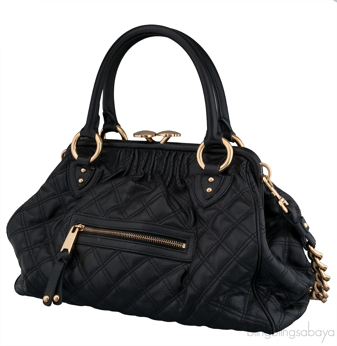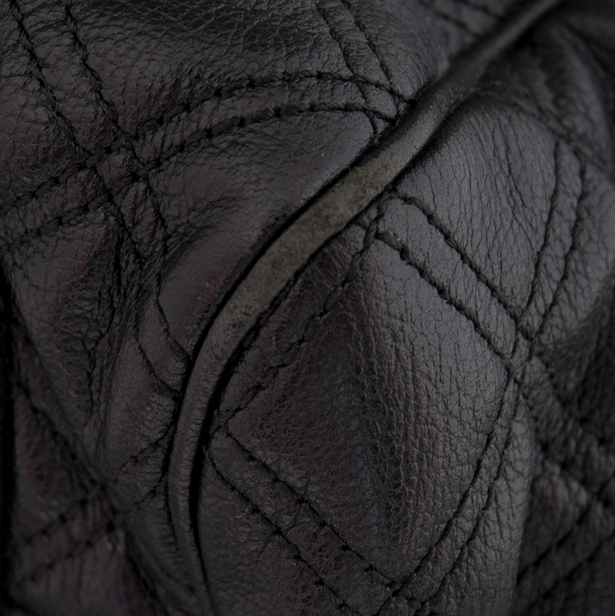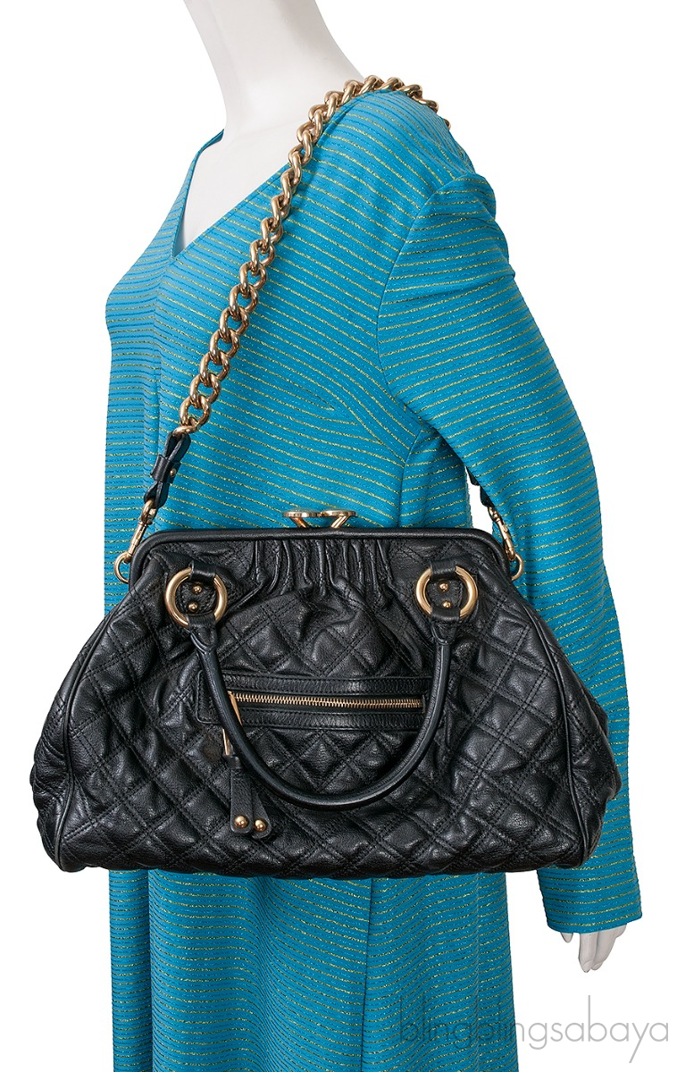 This Black Quilted Stam Bag from Marc Jacobsis made of a black quilted leather accented with the gold hardware. This bag features a diamond quilt design with ruched detailing, framed top, two rolled leather handles and a detachable gold chain and leather shoulder strap.