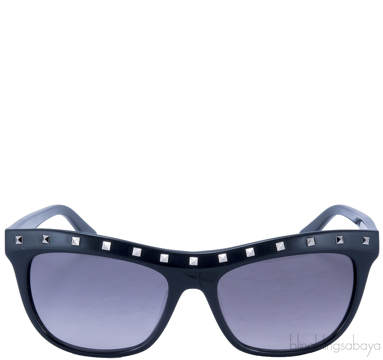 This Valentino Rockstud Sunglasses is crafted in black PVCc square frame with mini pyramid studs along tool bar. Valentino silver logo2 at temples and grey gradiient lenses. Lens measures 52 mm / Bridge 20 mm / Arm 130 mm