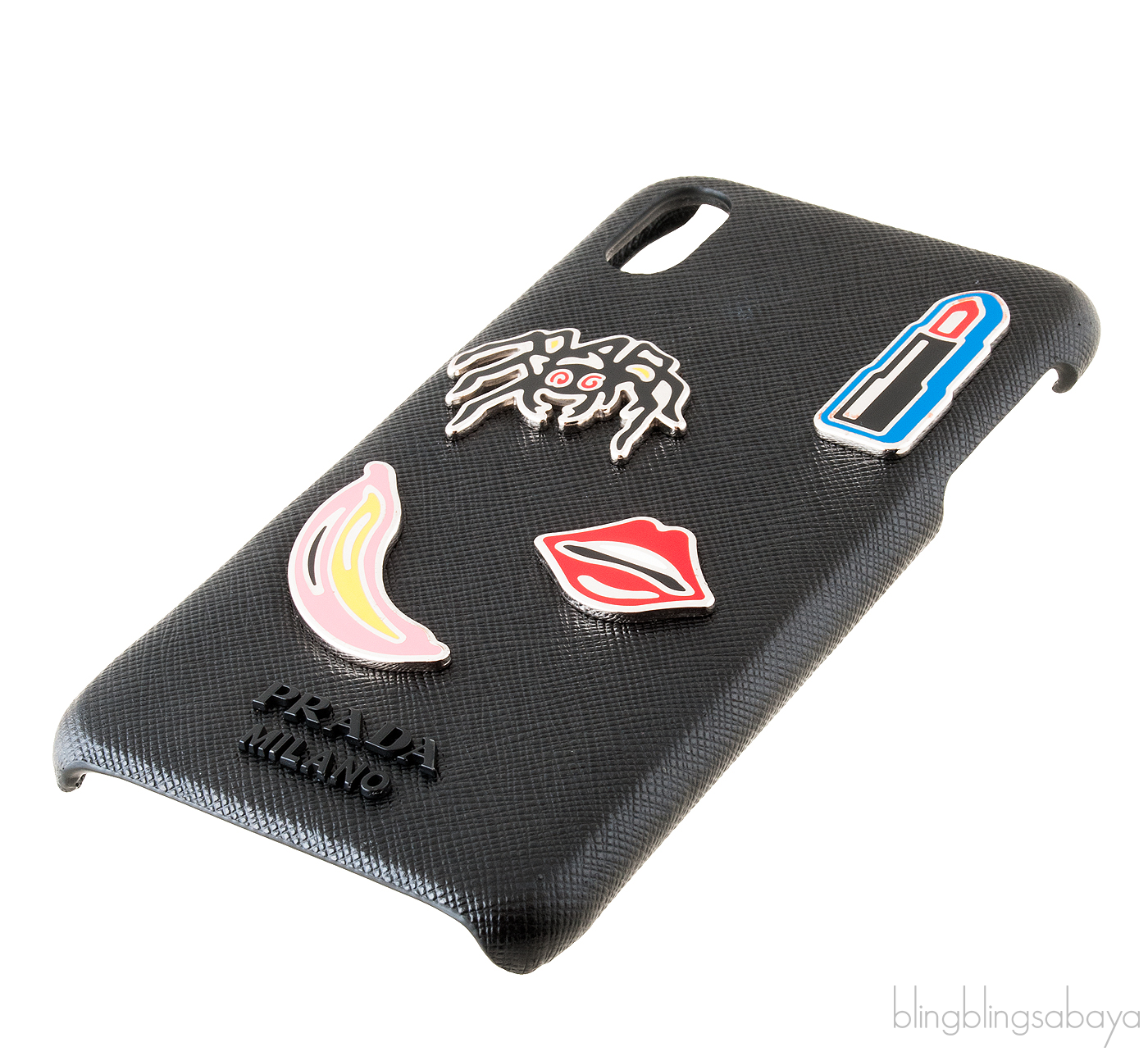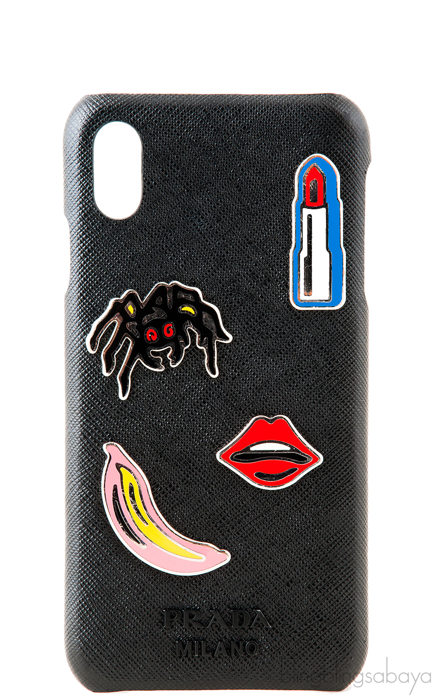 Cover your iPhone with this stylish Black Saffiano iPhone XS Case from Prada. This case is crafted in black saffiano leather featuring a noticeable enameled metal banana, spider, lipstick & lips appliqué. Fits iPhone XS Max!