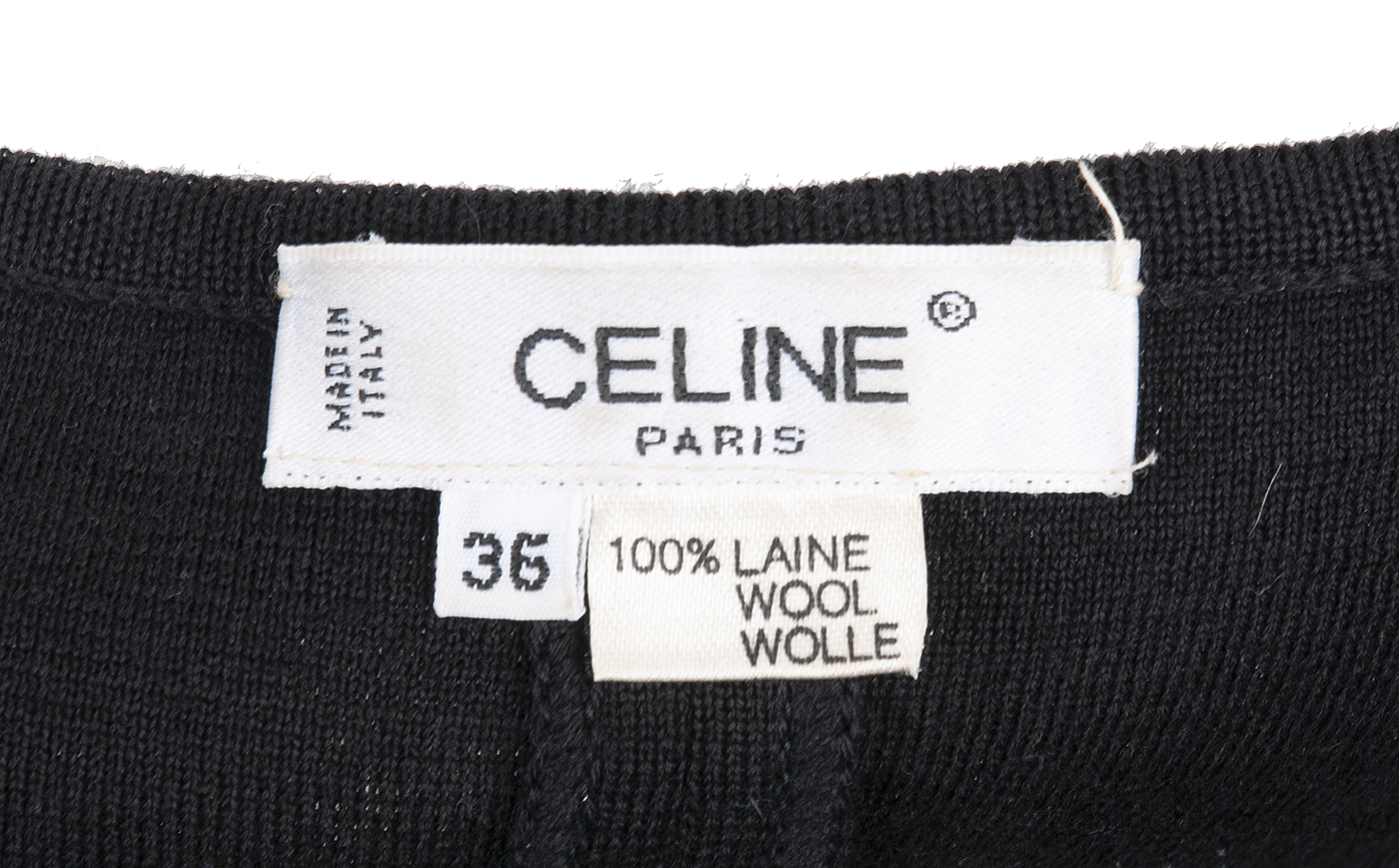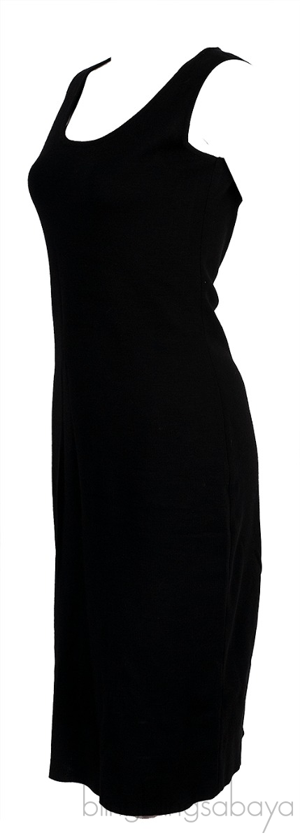 This Black Sleeveless Knee Length Dress from Celine is crafted in 100% Wool fabric in black. This dress features a stretch fabric, a scoop neckline, sleeveless, pull-over and has knee length hem.