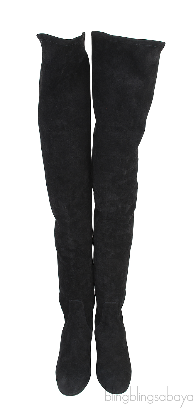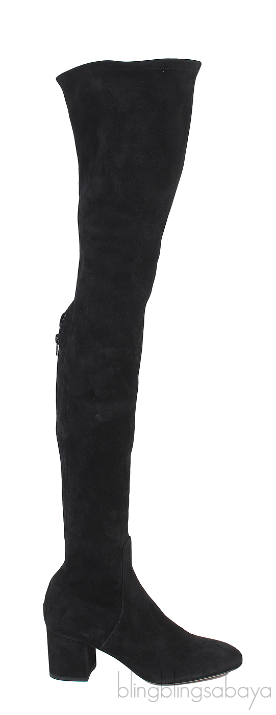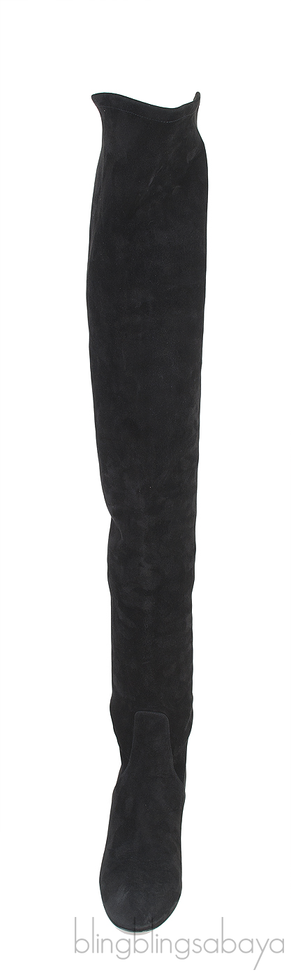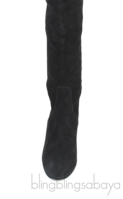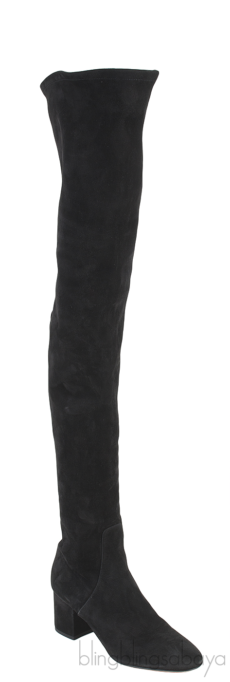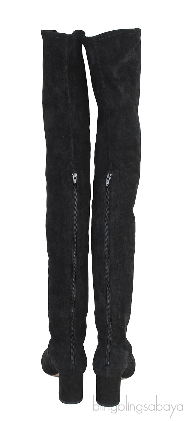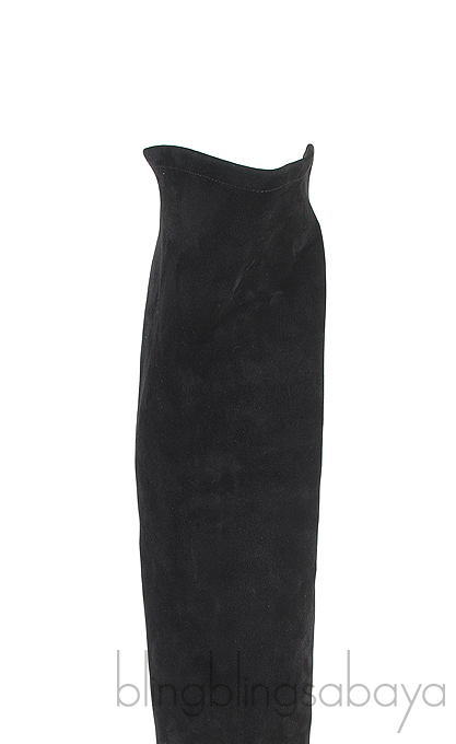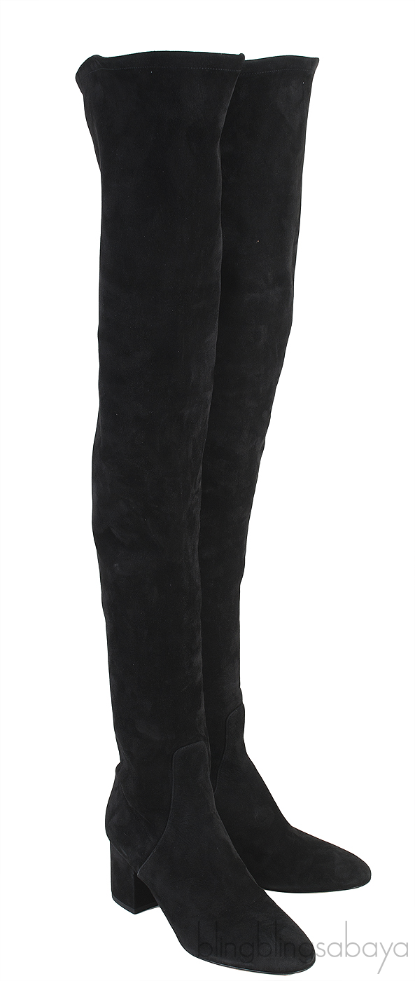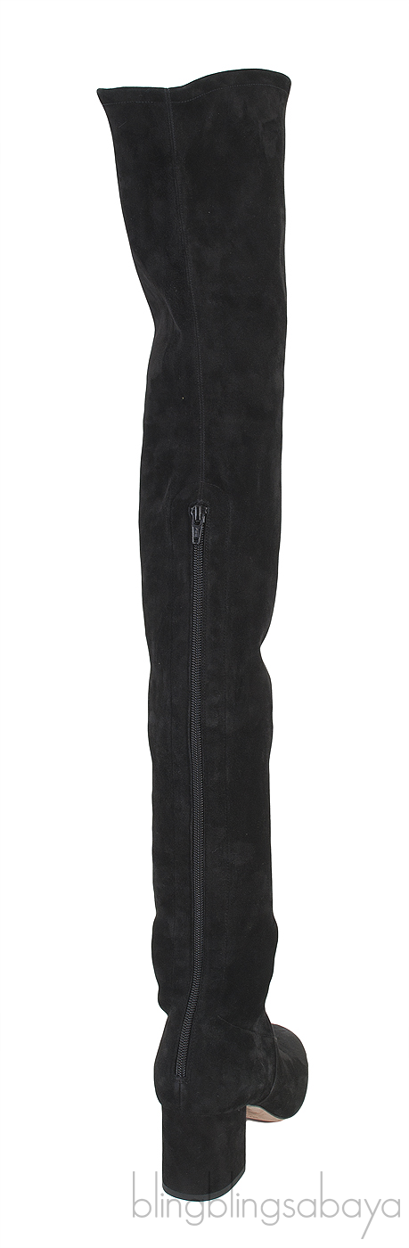 These Black Suede High Leg Boots from Valentino are made of black suede leather featuring a thigh high black leather shaft, round almond toe, covered stack heels measuring 60 mm high, leather insole and leather sole.
