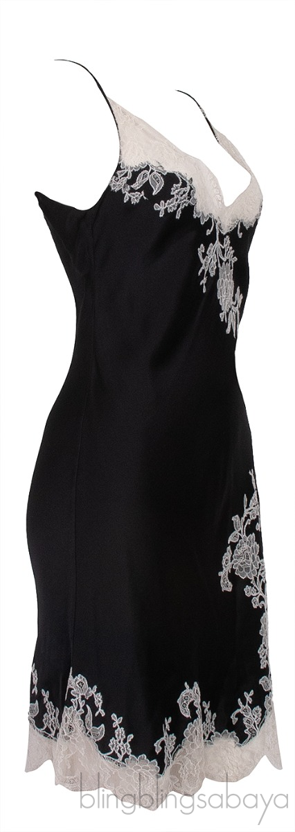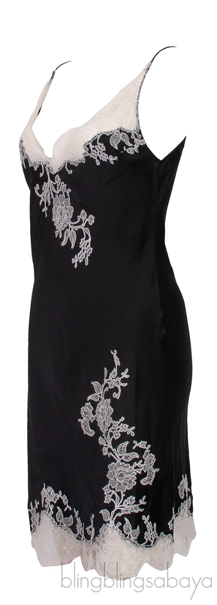 This Black & White Lace Trim Cami Dress from Carine Gilson is crafted from 100% Silk fabric in black hue with white floral lace trim. This dress features a sweatheart neckline, sleeveless, spaghetti straps and scallop lace hemline.