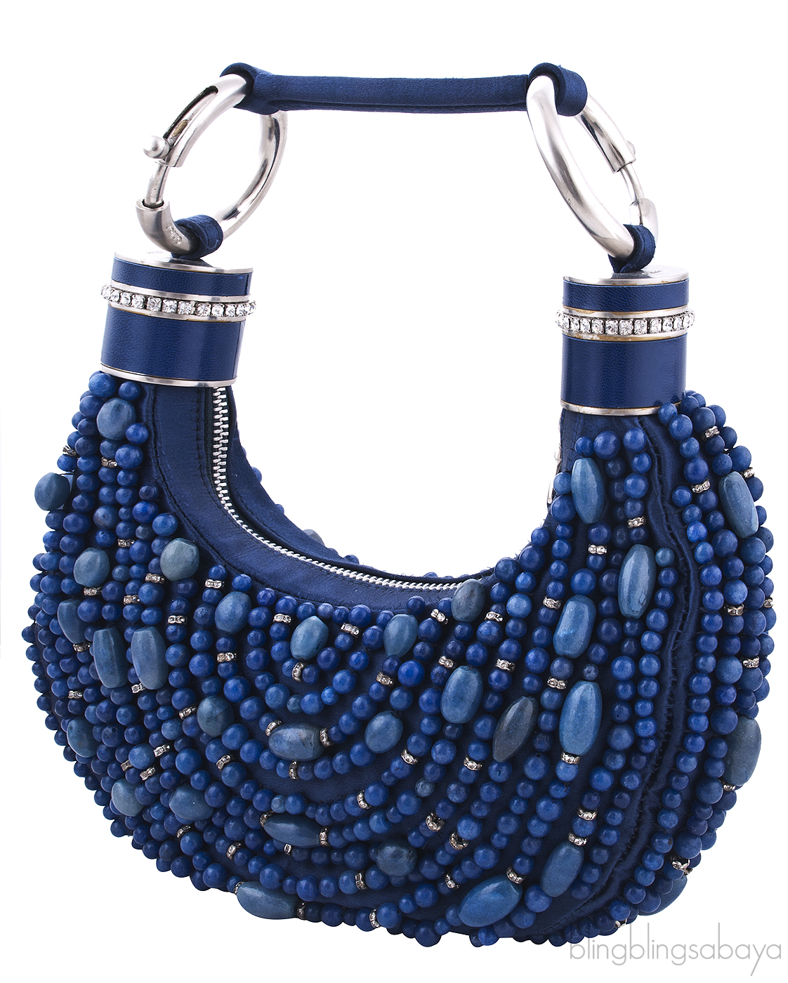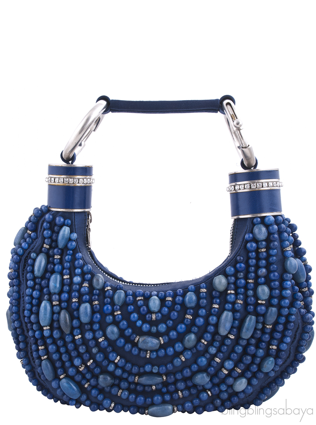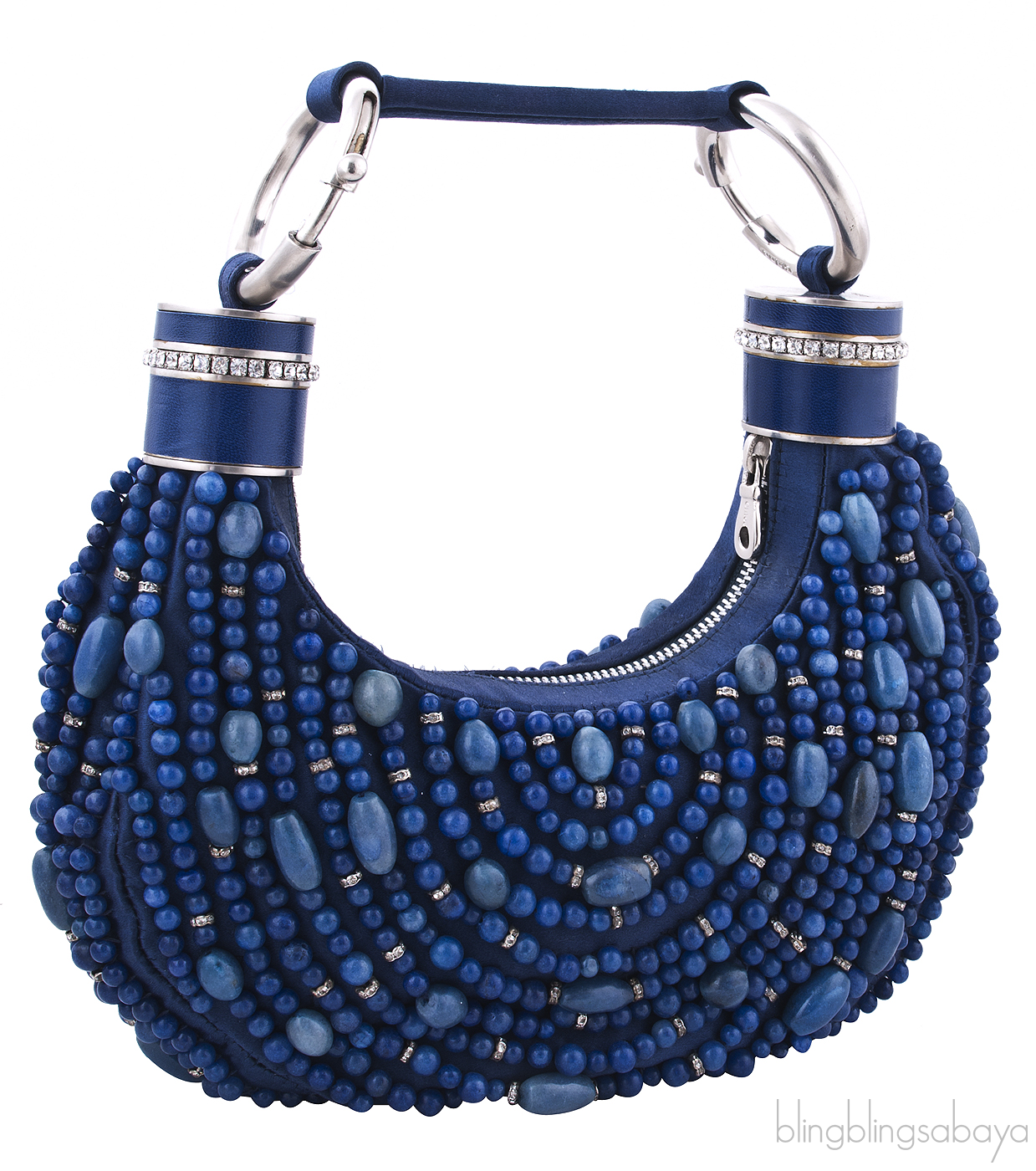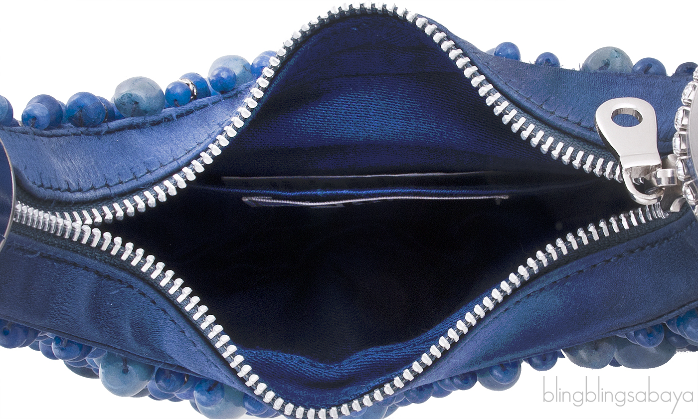 This Blue Beaded Bracelet Bag from Chloe is crafted in blue satin fabric accented with silver hardware. This hobo handbag is fully embellished with blue and dioptase bead stones and crystals with flat satin covered shoulder strap with matte silver ring loops. It has the zip opening at top and interior is fully lined with coordinating fabric with a slit patch pocket.