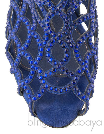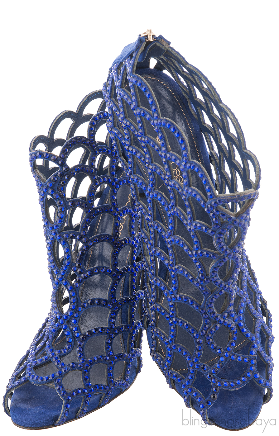 These Blue Crystal Mermaid Boots from Sergio Rossi are made of blue suede leather uppers lined with leather blue lining. These pair of heels features a scalloped caged design throughout embellished in blue Swarvoski crystals. Concealed zipper on heel with gold-tone stamped pull tag, stiletto heels measuring 120 mm high and leather sole.