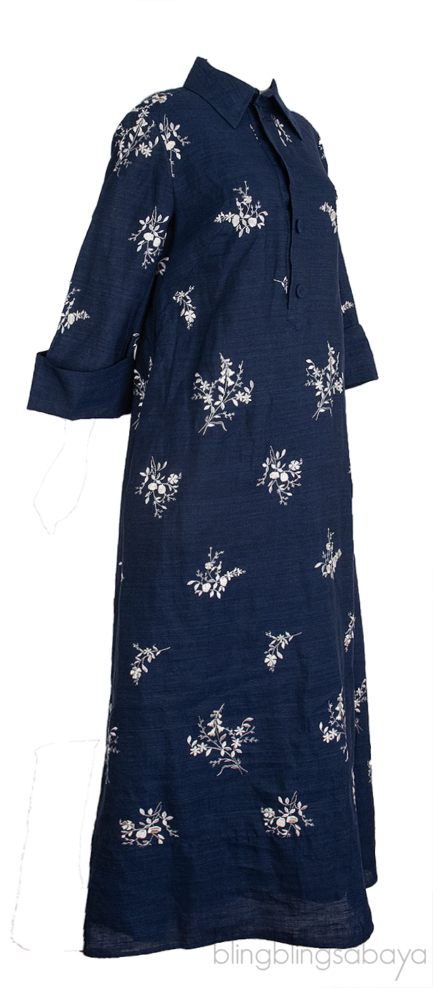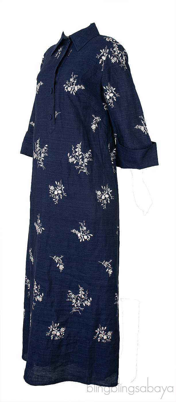 This Blue Denim Floral Embroidered Dress from Erdem is made from a blend of linen, viscose, and polyester in a dark blue shade, adorned with striking white floral embroidery. It features a pointed collar, a partially buttoned front, three-quarter sleeves with folded cuffs, and is fully lined, offering a mid-length silhouette. This dress comes with detachable fabric belt.