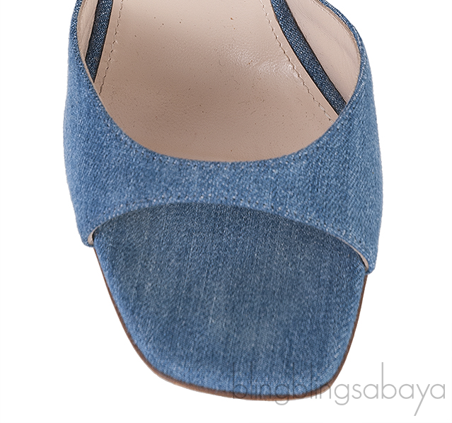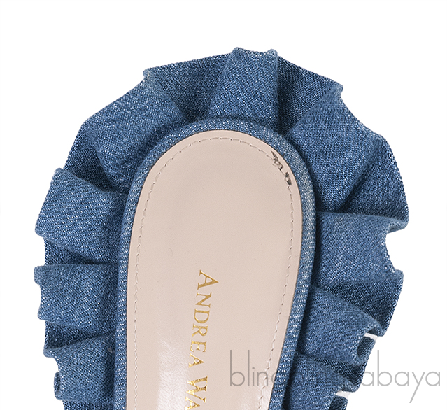 These Blue Denim Rouches 105 Ruffled Mule Sandals from ANDREA WAZEN are crafted from blue denim fabric upper with leather lining. These sandals features a peep square toe, ruffled trim, leather lined insole and sole, and heels measuring 105 mm high.