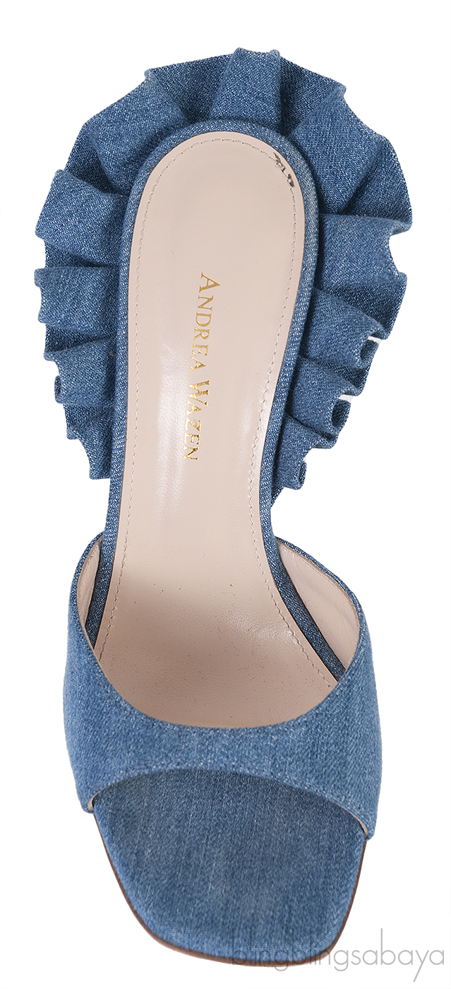 Blue Denim Rouches 105 Ruffled Mule Sandals from ANDREA WAZEN!