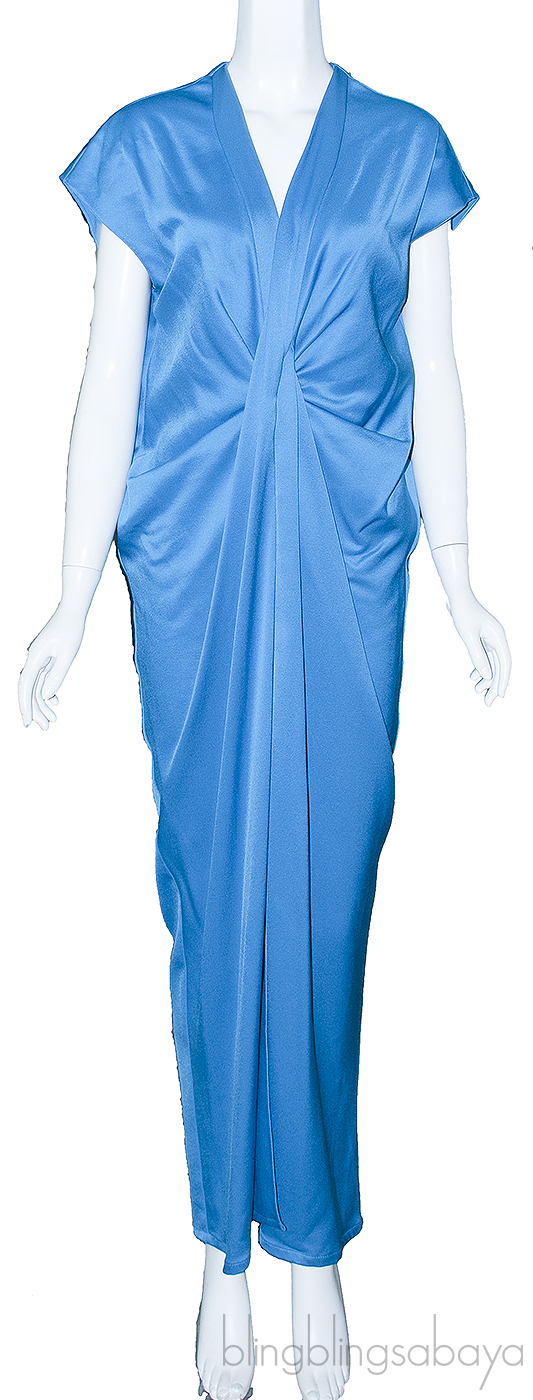 This Blue Gathered Front Dress from Lanvin is made of 75% Viscose and 25% Wool in plain blue featuring a deep V-neckline, cap sleeves, gathered detailing a front, maxi length with long slits at front.