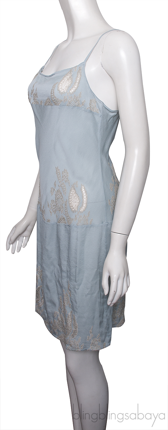 This Blue Grey Silk Chemise from Carine Gilson is crafted from sumptuously soft and lustrous silk fabric in blue grey hue. This dress features a non-adjustable spaghetti strap, pull-over style with off-white lace panel.