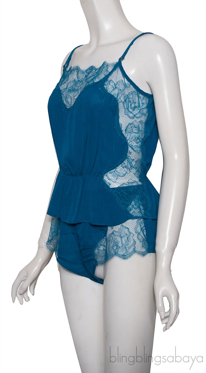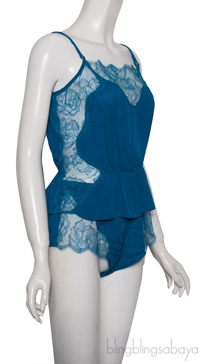 This Blue Lace Trim Camisole Set from Fleur Du Mal is crafted from 100% Silk fabric with lace trimming. Top features a a scallop neckline, sleeveless, adjustable shoulderstrap and elastic design at waist. This top comes with sexy bottom with elastic waist and lace trim detailing.