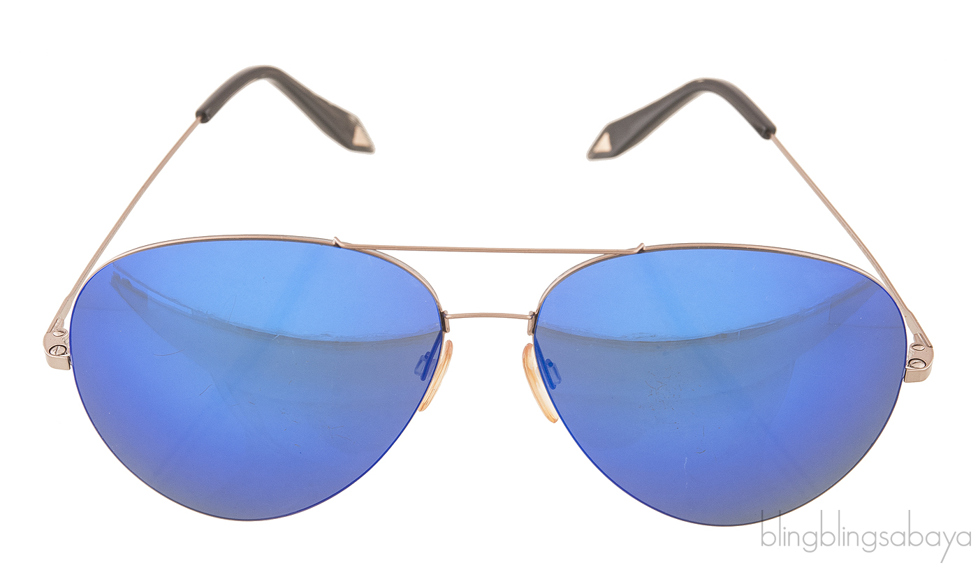 This Blue Mirrored Sunglasses from Victoria Beckham features a gold metal frame with metal handles, sweat bars, nose pads, and aviator blue lenses. measuring 63 mm / Bridge 16mm / Arms 140 mm.