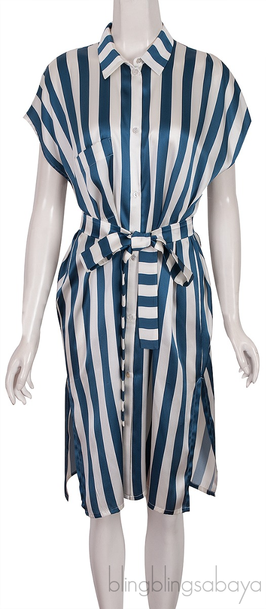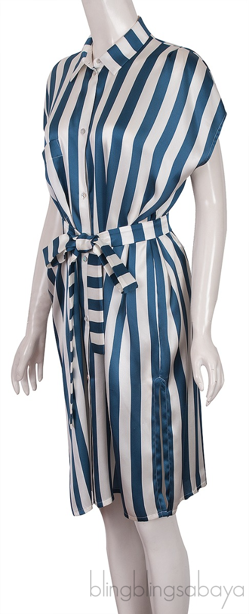 This Blue & Off-white Stripe Belted Dress from Violet & Wren is crafted from 100% Silk fabric. The dress features a classic collar, pocket at front, sleeveless, button fastening through the front and side slit.
