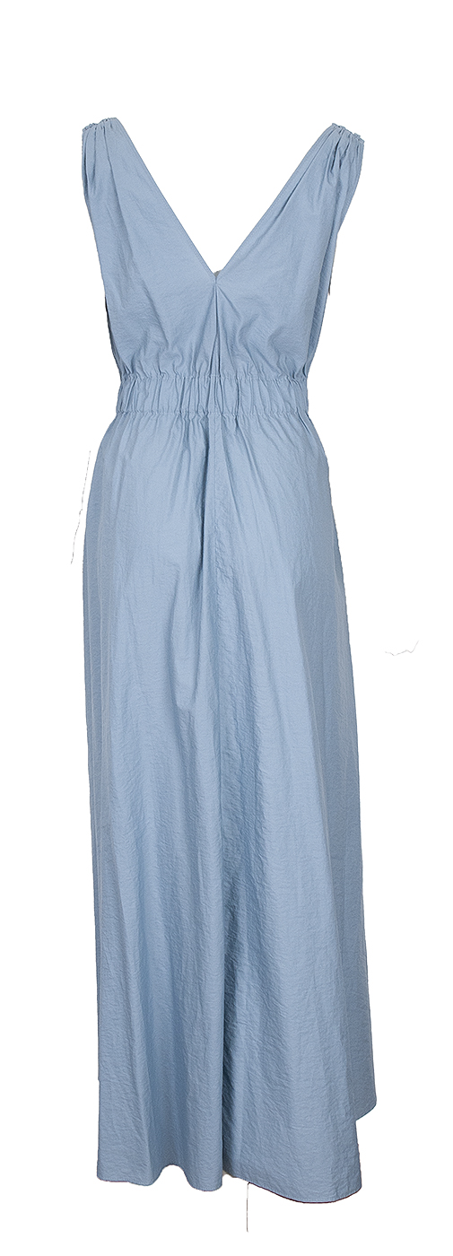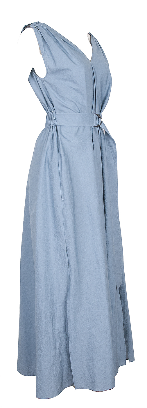 This Blue Poplin Minili Shoulder Belted Midi Dress from Brunello Cucinelli is crafted from blue plan fabric featuring a v-neck at front and back, gathered shoulder with monili details, elastic at waist line at rear, undetachable belt with D-ring,