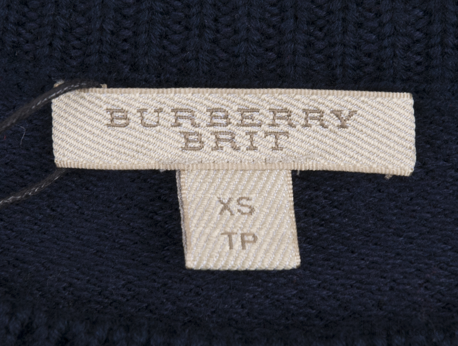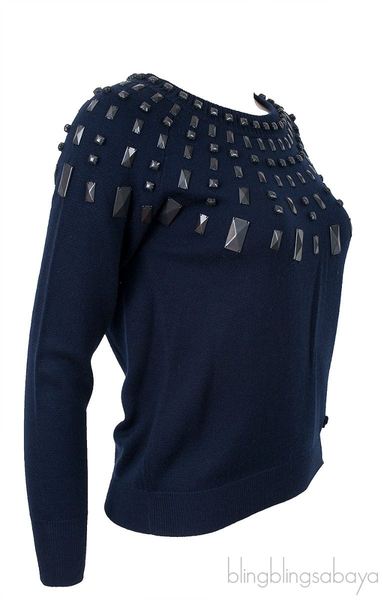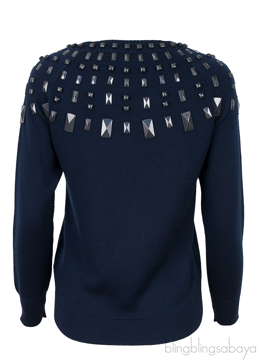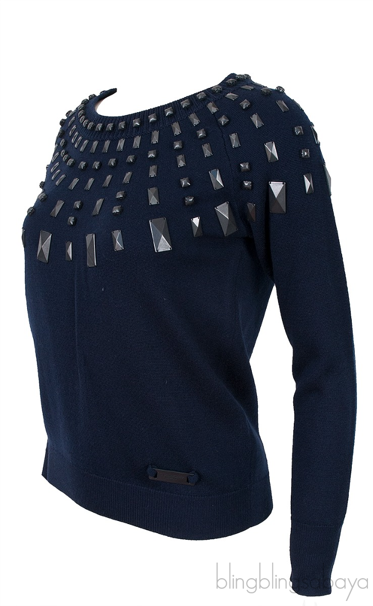 This Blue Studded Sweatshirt from Burberry Brit is crafted from 54% Wool and 46% Cotton on dark blue color. This sweatshirt features a ribbed round neckline, long sleeves with ribbed cuffs, black metal studds in different sizes embellishment at front, pull over style and ribbed hemline.
