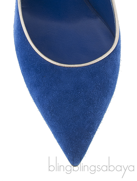This Blue Suede Chic Pump from Casadei are made of blue suede leather with blue leather lining and light gold trimming. These shoes features a pointed-toe, leather lined insole, metal light gold heels measuring 130 mm and leather sole.