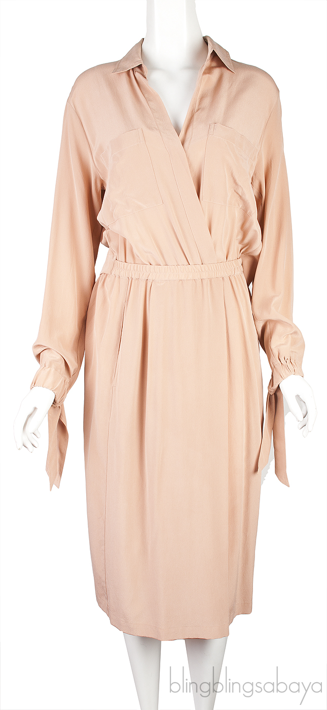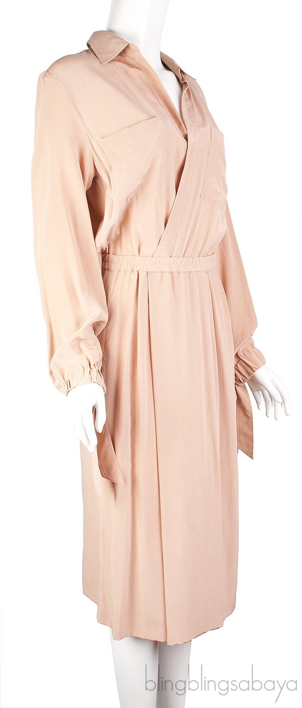 This Slit Back Shirtsress from Vince is crafted from 100% Silk fabric in blush color. This dress features a classic collared neck, long sleeves with elastic cuffs, snap fastening at front, patch pocket at front, elastic waist, slit at back and midi length skirt with front slit