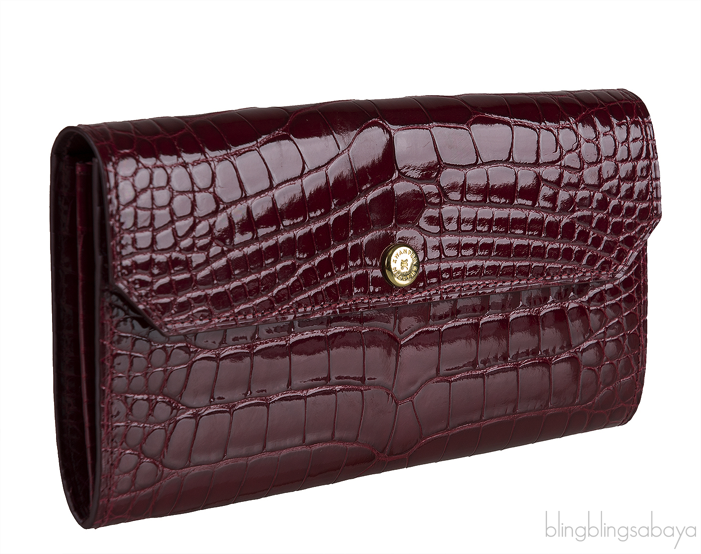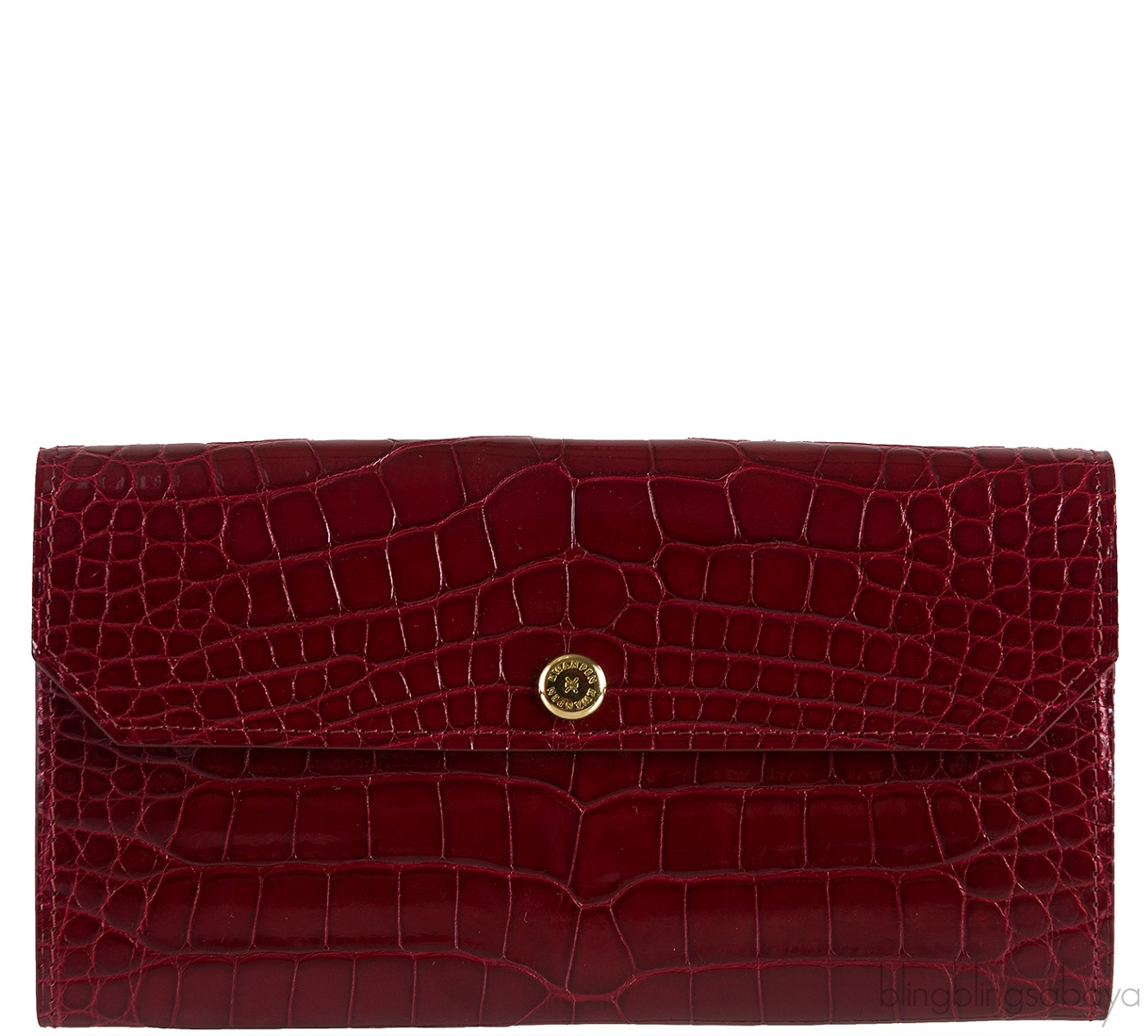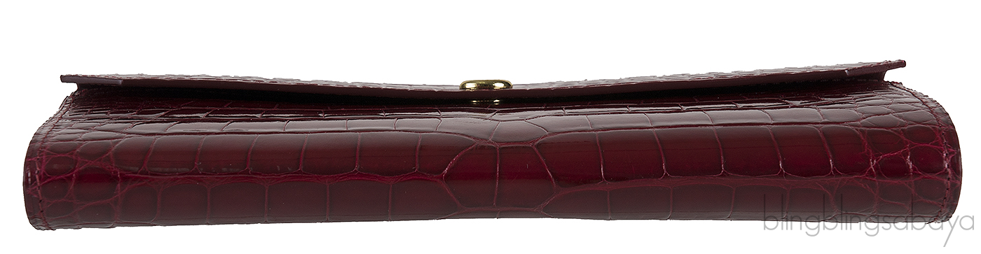 This Bordeaux Crocodile Wallet from Kwanpen is crafted from exotic crocodile leather accented with gold hardware. This wallet is in beautiful patent Bordeaux color featuring a flap cover with gold button closure, 4 credit card slotsat front, two major compartment, 16 credit card slots inside and zip compartment divider.