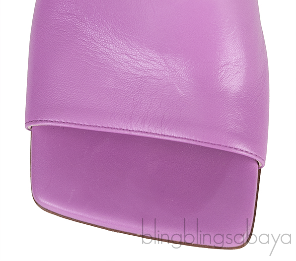 These Purple Stretch Leather Sandals from Bottega Veneta are crafted from supple lambskin nappa leather in purle purple hue with leather sole. These sandals features a leather lined insole, peep square toe , rubber-injected sole for added comfort and heels measuring 90 mm high.