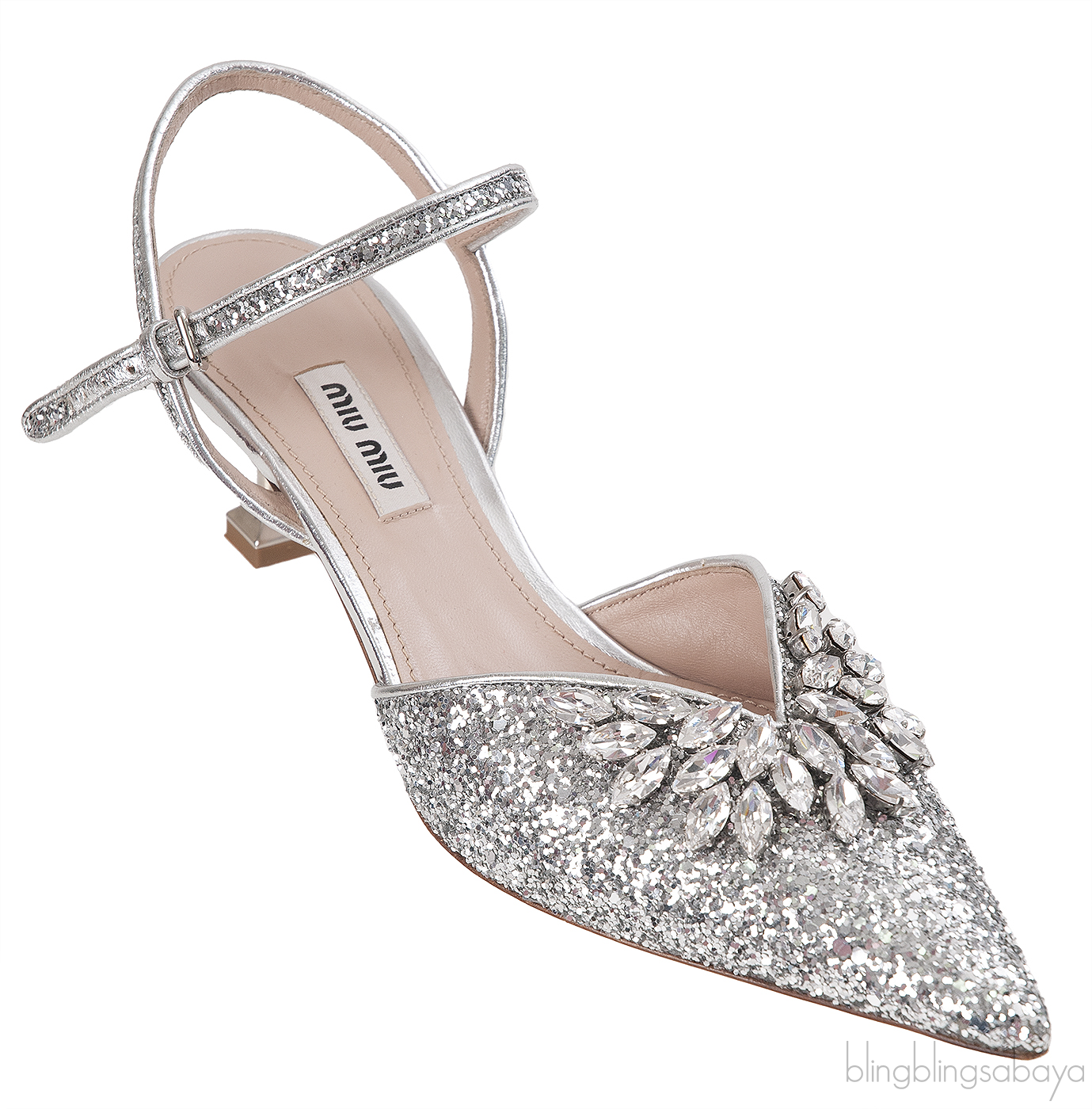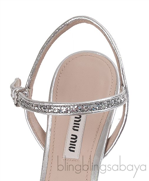 These Brooch Silver Glitter Pump from Miu miu are crafted with silver glitter upper and Leather insole and sole. Crystal brooch embellishment, Adjustable ankle strap with metal buckle and a pointed toe design, heels measuring 50 mm high.