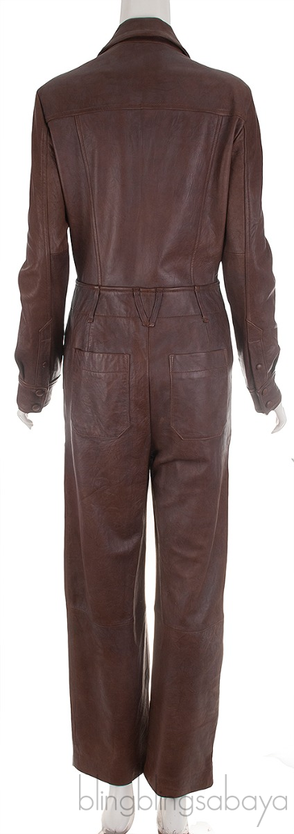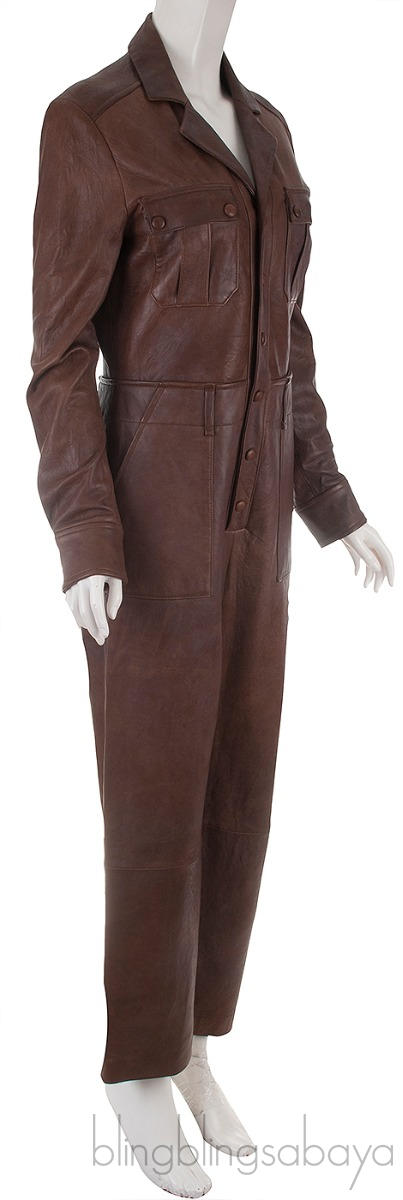 This Brown Artemis Jumpsuit from Veronica Beard is crafted from 100% Lambskin leather and 100% Polyester lining. This Jumpsuit features a smooth, lightly crumpled leather in rich brown hue with classic collar, long sleeves with button cuffs, snap fastening at front, and six pocket styling.