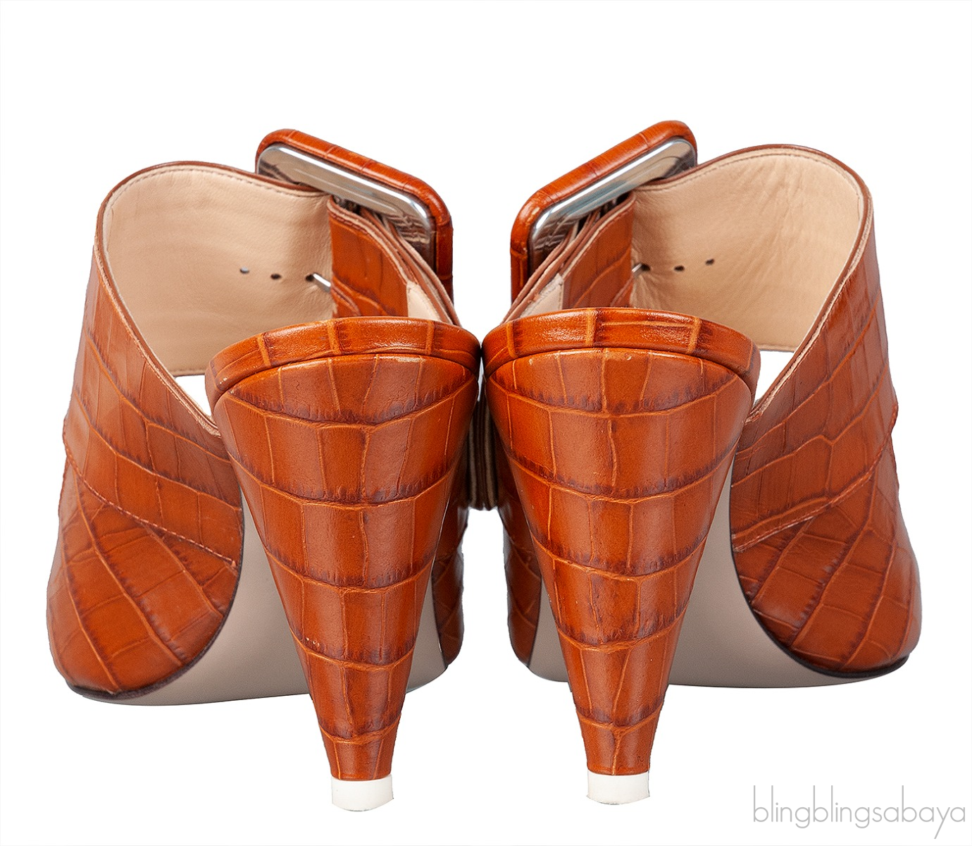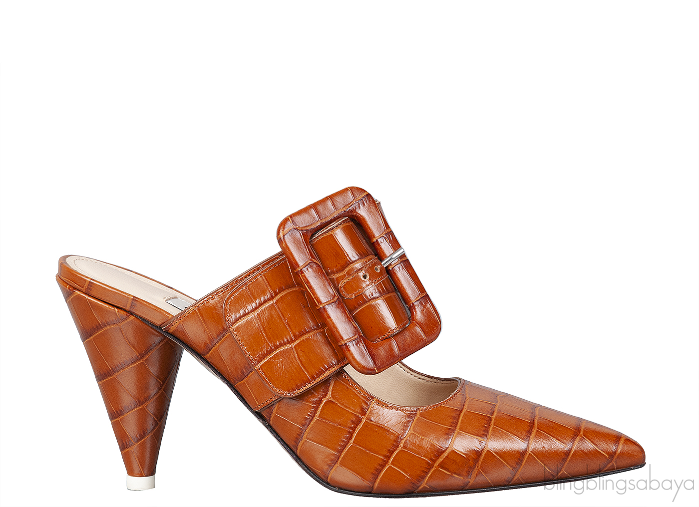 These Brown Croc Embossed Chloe Mules from Attico is crafted from croc embossed leather in rich brown with nude leather lining. These mules features a pointed toe, wide strap with oversize buckle at vamp, leather lined insole and sole, 100 mm covered cone heel.