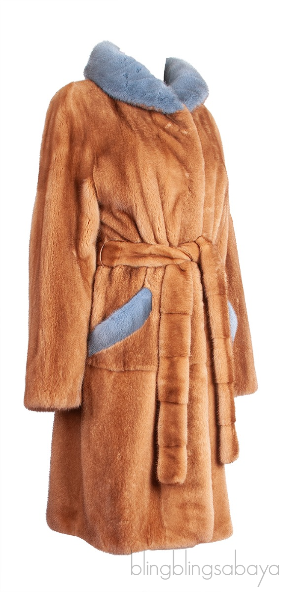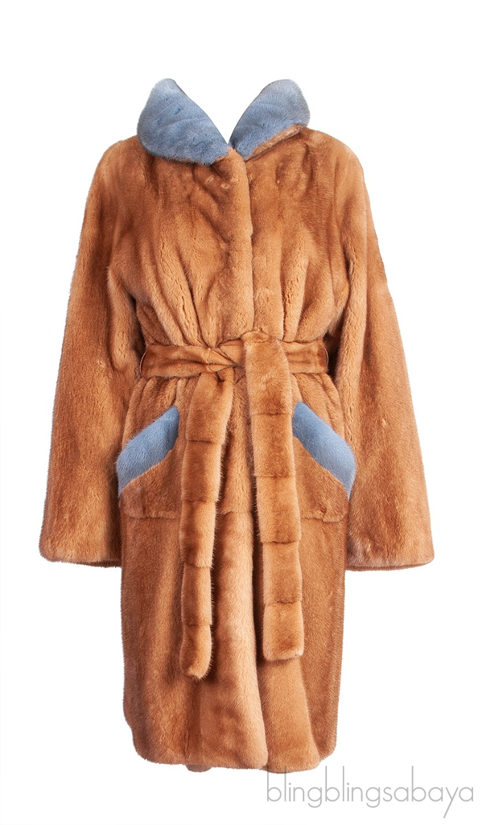 This Brown Mink Fur Coat from Saga Furs is crafted in Mink Fur with satin lining. This Coat features a contrasting blue grey collar, long sleeves, button fastening at front, two pockets at front and detachable belt.