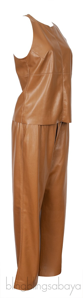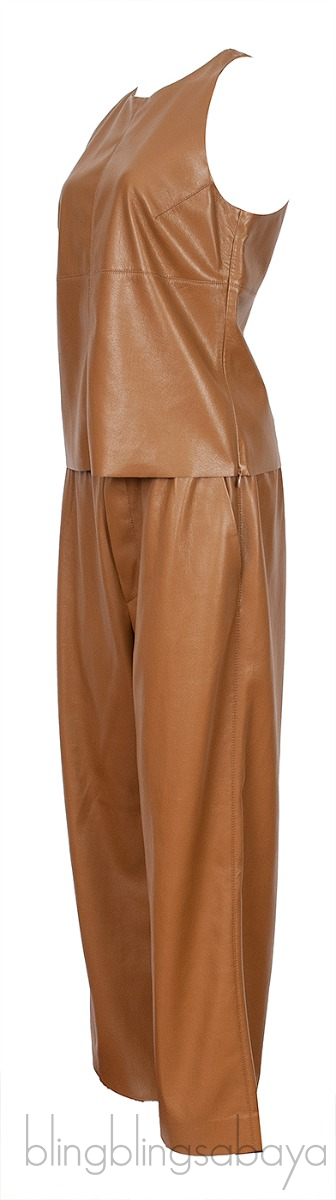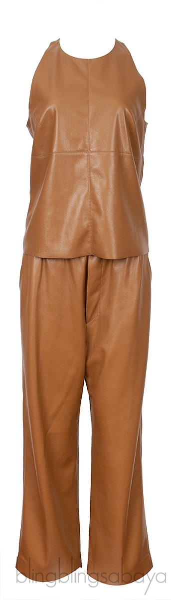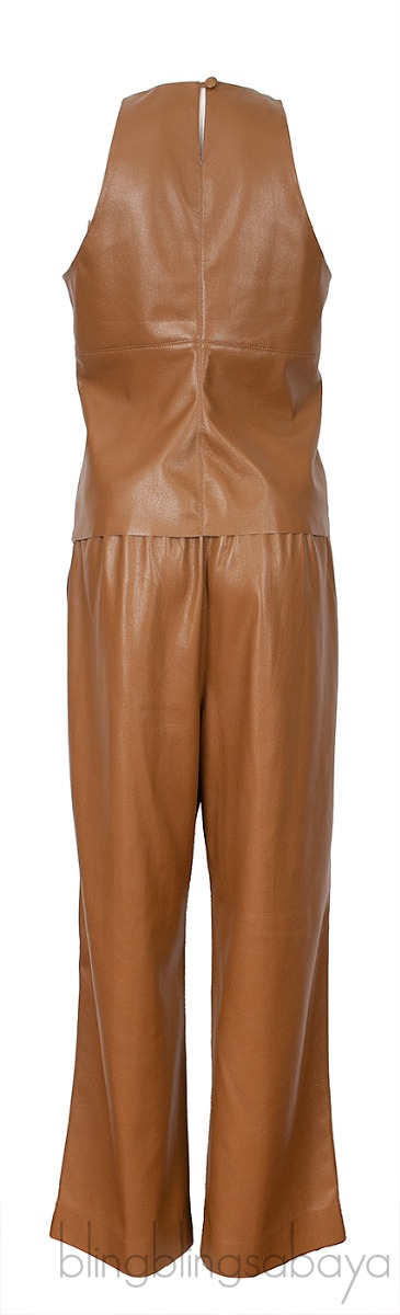 This pair of Brown Tank Top & Trouser from Nanushka is crafted in 65% Polyester and 35% Polyurethane in ligth brown hue. Top features a scoop neckline, sleeveless and button fastening at rear. Brown Trouser features an elastic waist line, side pockets and straight cut.
