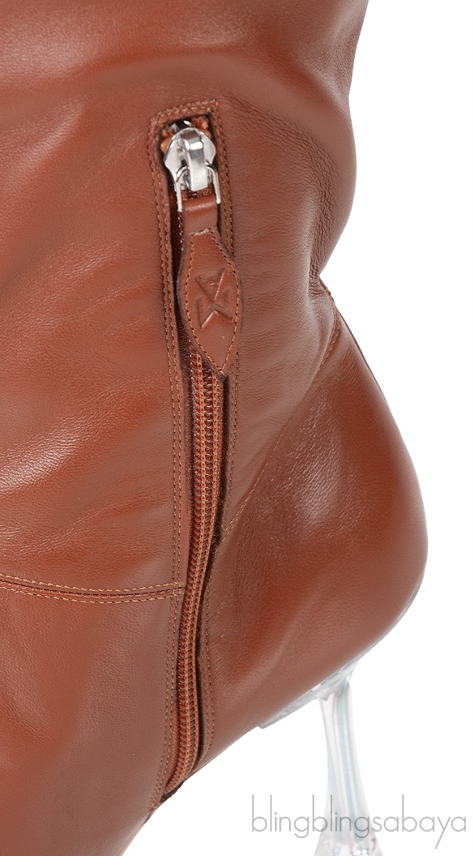 These Brown Thigh-high Leather Boots from Amina Muaddi are crafted from brown leather upper with old rose leather lining. These boots features a gathered design thigh-high shaft, slip-on, side zipper, pointed toe, curved heels measuring 90 mm high and leather insole and sole.