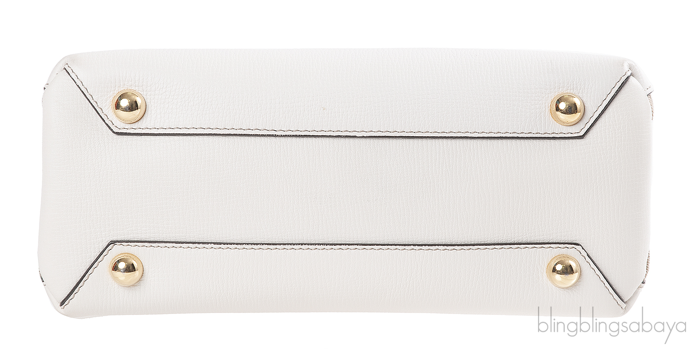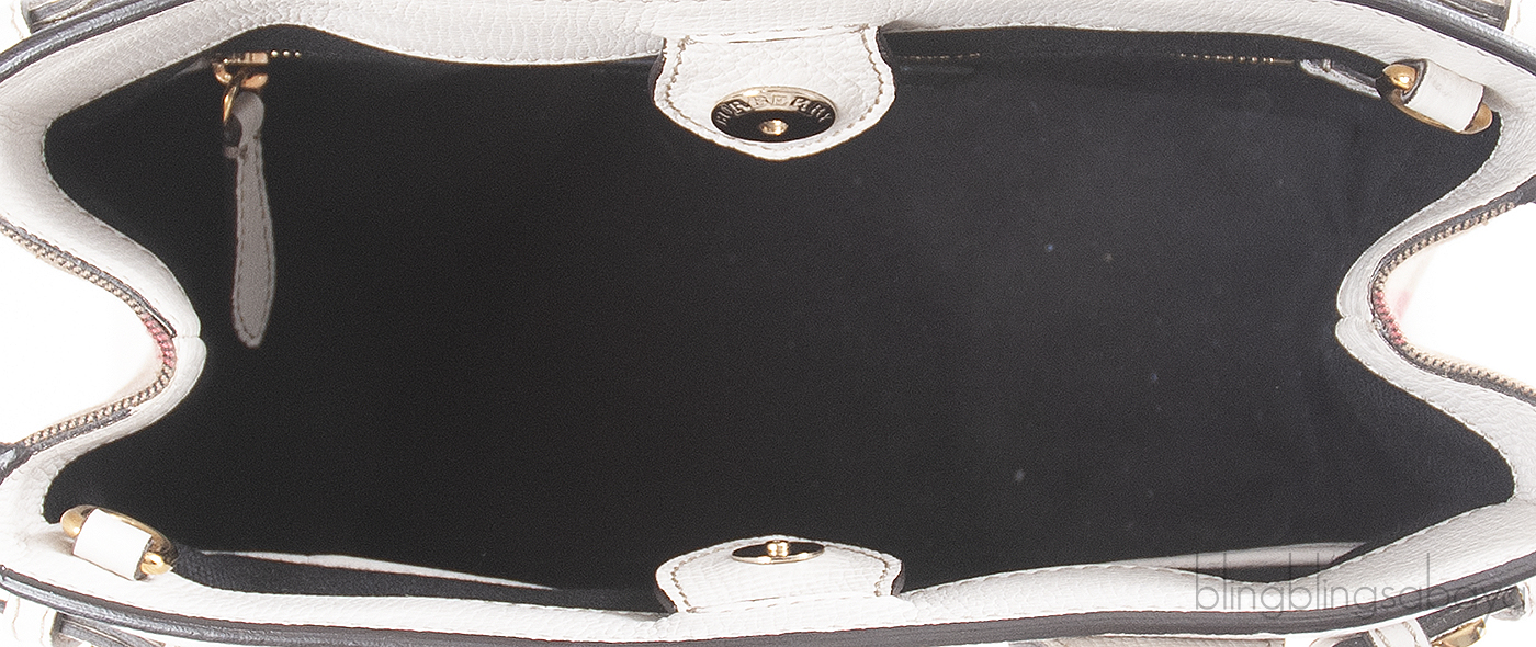 This Burberry White & Checkered Banner Top Handle Bag is crafted from white grained leather and house checked canvas accented with the gold hardware. This bag features a sturdy rolled leather handles and removable shoulder bag. Interior is fully lined with fabric and has two interior patch and one zip pocket inside.