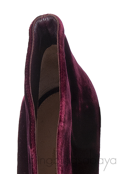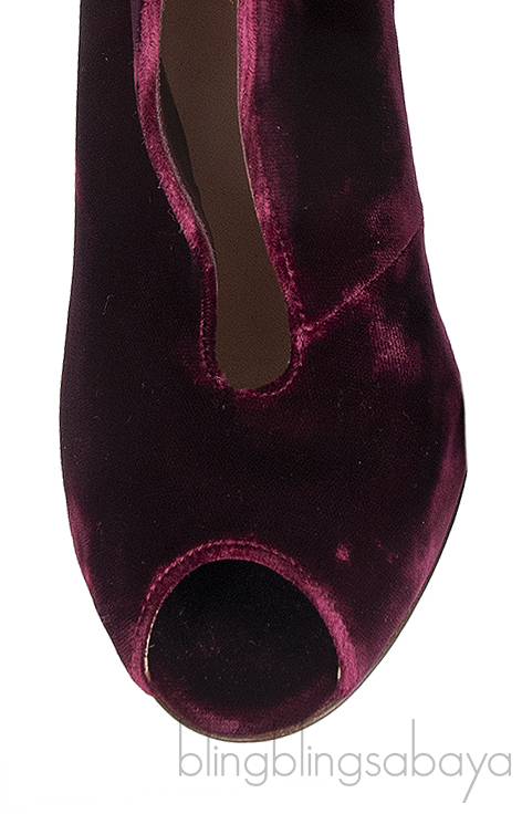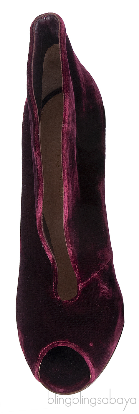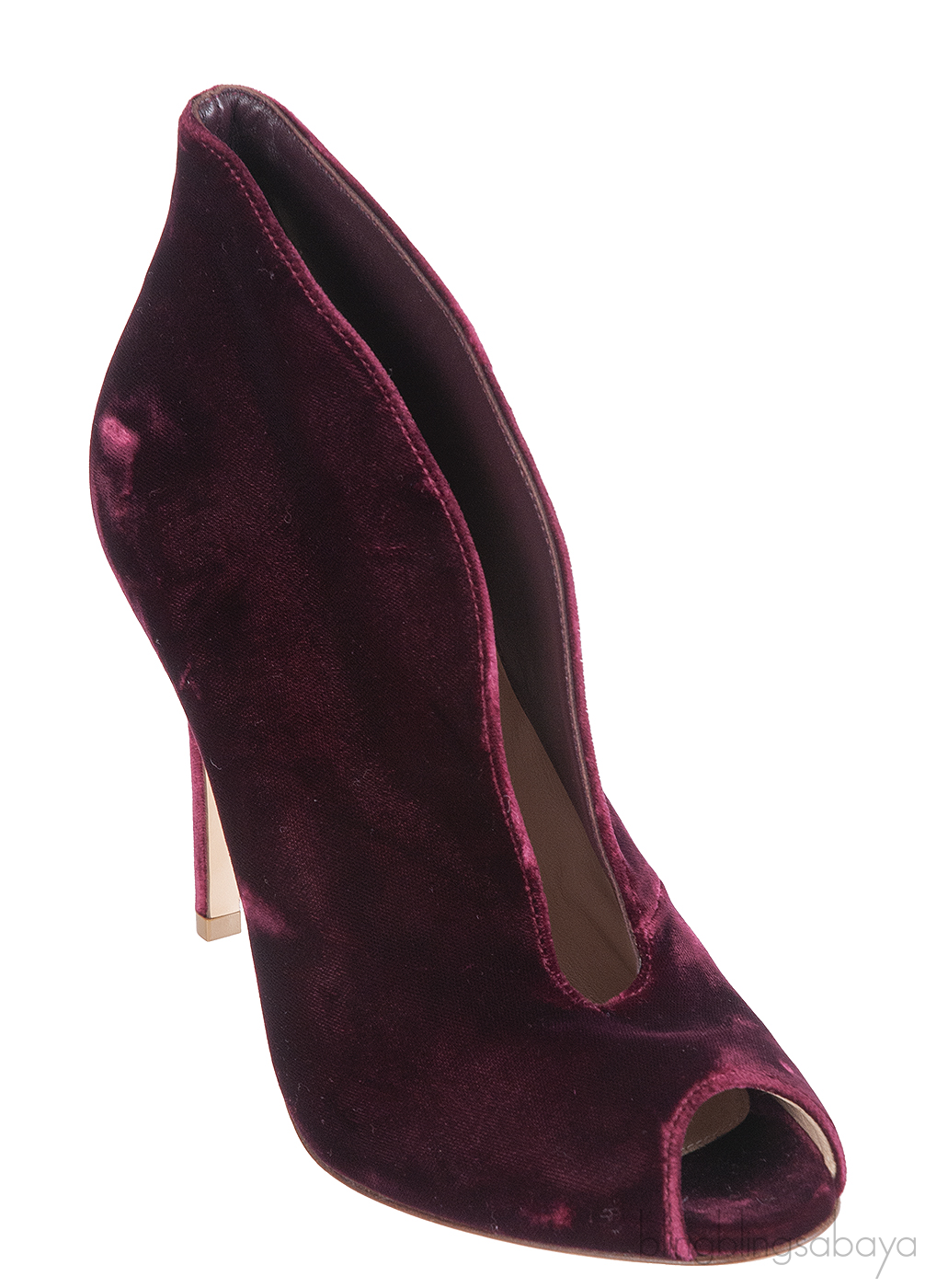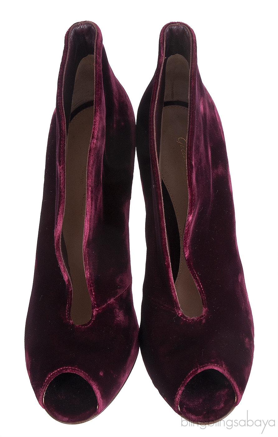 These Burgundy Velvet Ankle-Flare Boots from Gianvito Rossi are made of burgundy smooth velvet upper featuring a split front vamp, peep almond toe, covered sexy stiletto heels measuring 4" high, leather lined insole and leather sole.