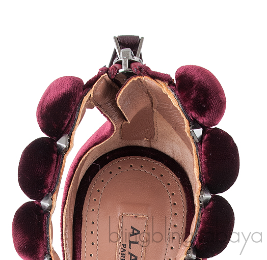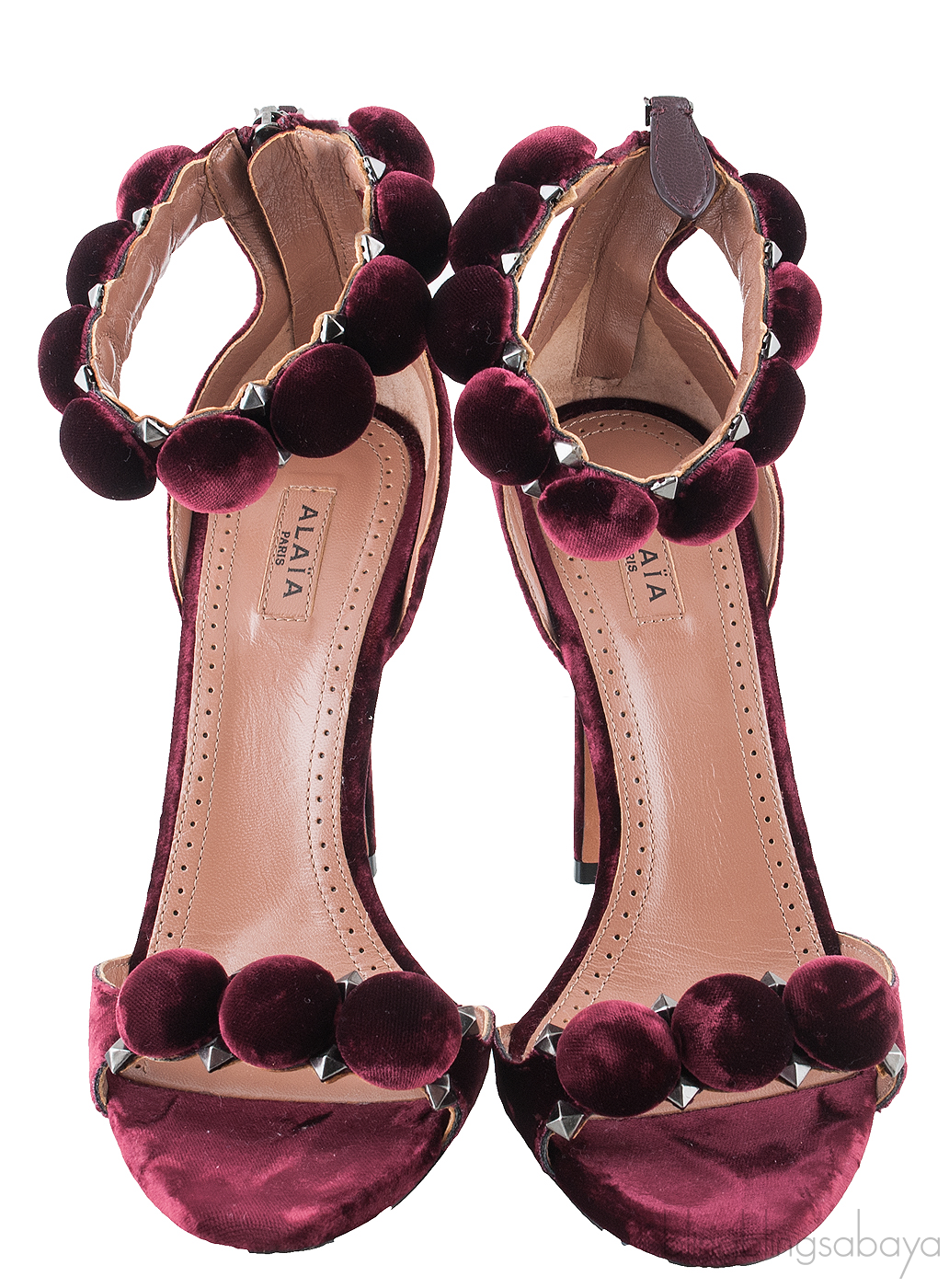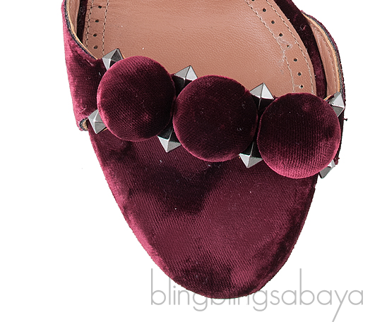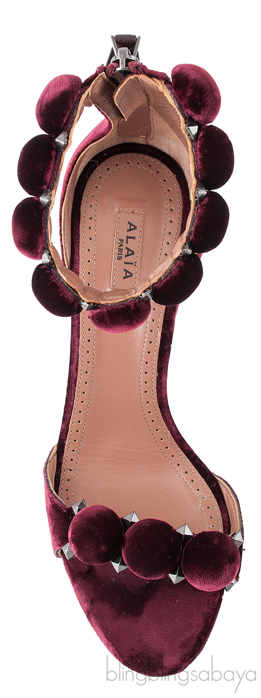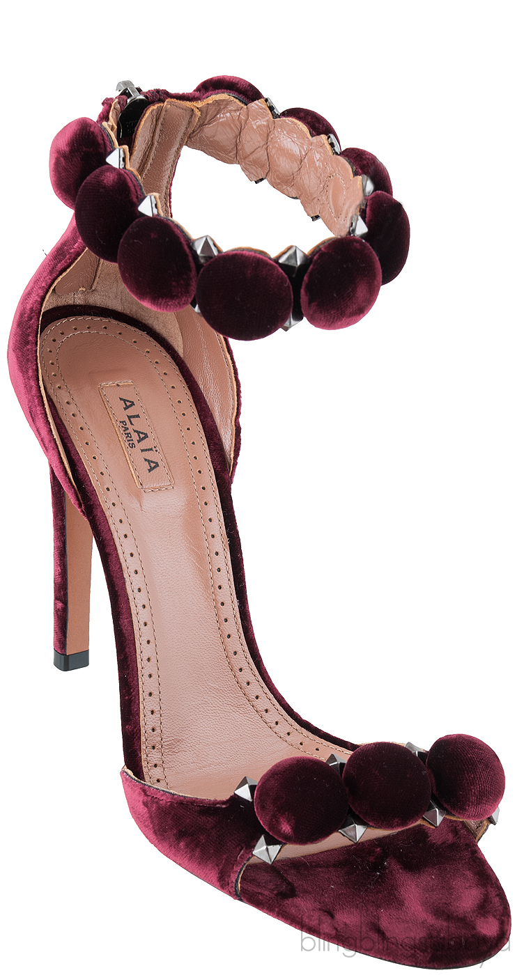 This Burgundy Velvet Bombe Heels from Alaia is beautifully crafted in sumptuous burgundy velvet fabric upper and lined brown leather. These "Bombe sandals features a round almond peep toe, hand-embellished with gunmetal studs at the ankle strap, zip fastening at the heel counter, leather lined insole, velvet covered stiletto heels measuring 110 mm high and leather sole.