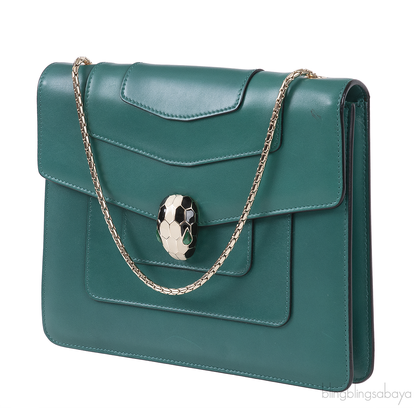 This enticing Serpenti Crossbody bag is beautifully crafted in dark green Calfskin Leather. This bag features the most famous light gold \"Serpent\" head closure in black & white enamel with seductive eyes in malachite that perfectly matches with a precious shoulder snake body shape chain.