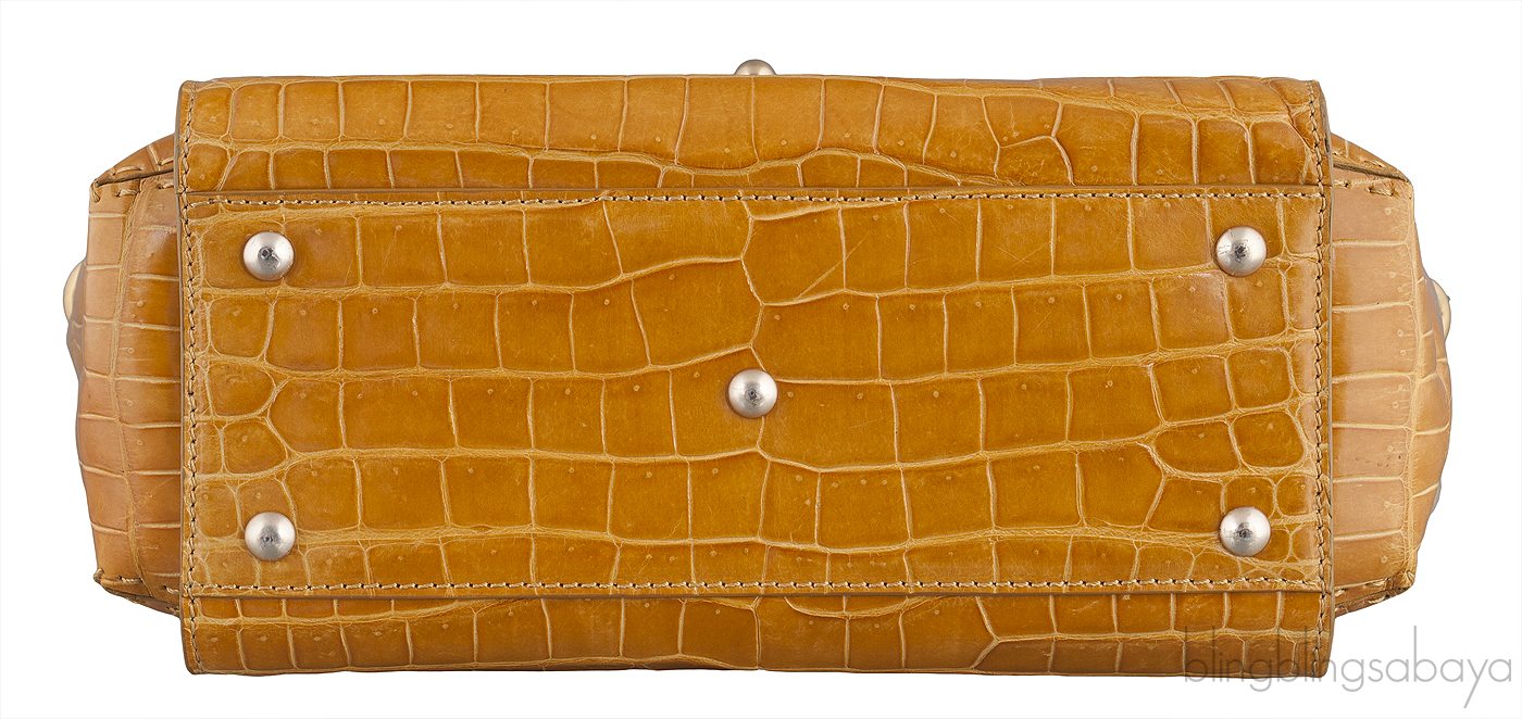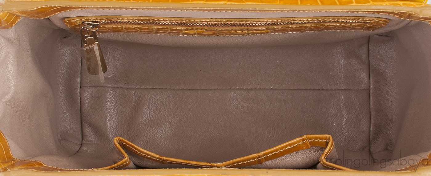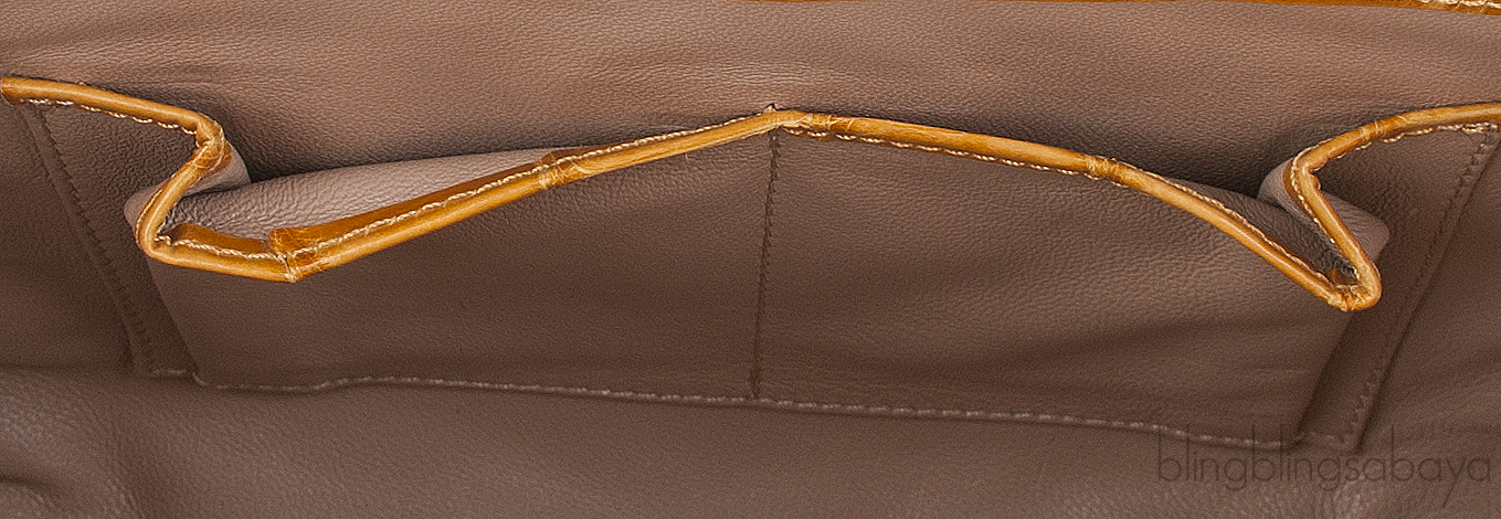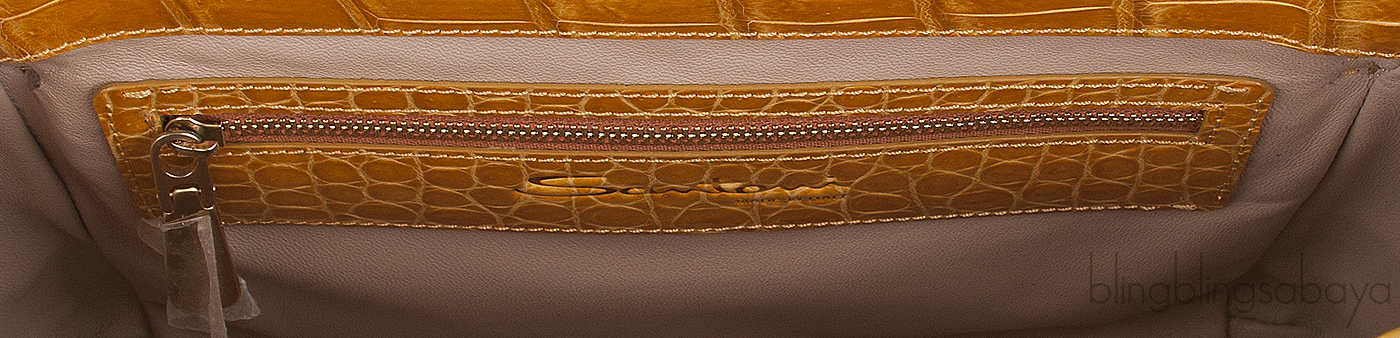 The roomy interior is fully lined with nude leather lining trimmed with crocodile leather and has one front flap pocket at front, two small patch pockets and zip pocket on the interior.