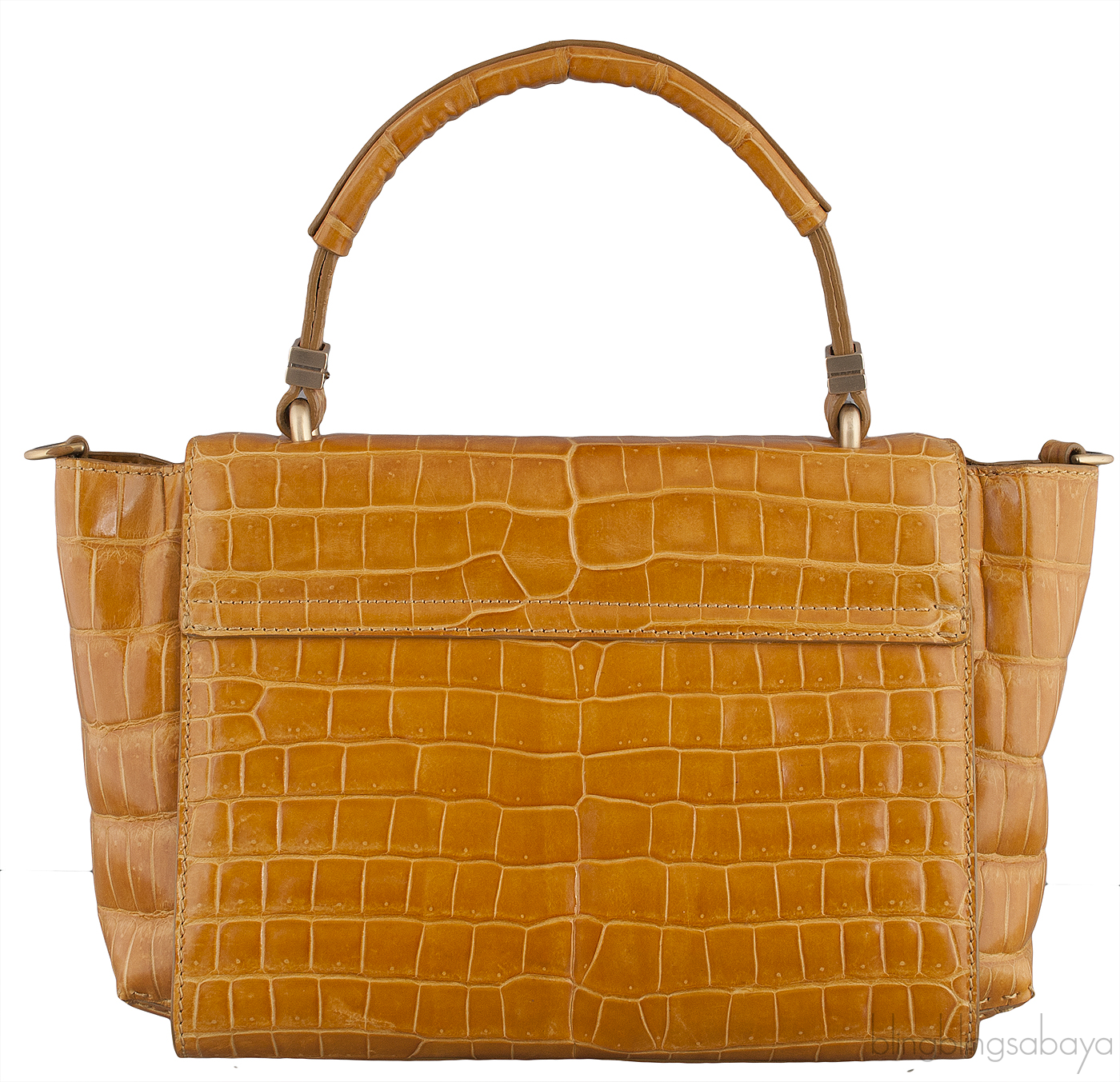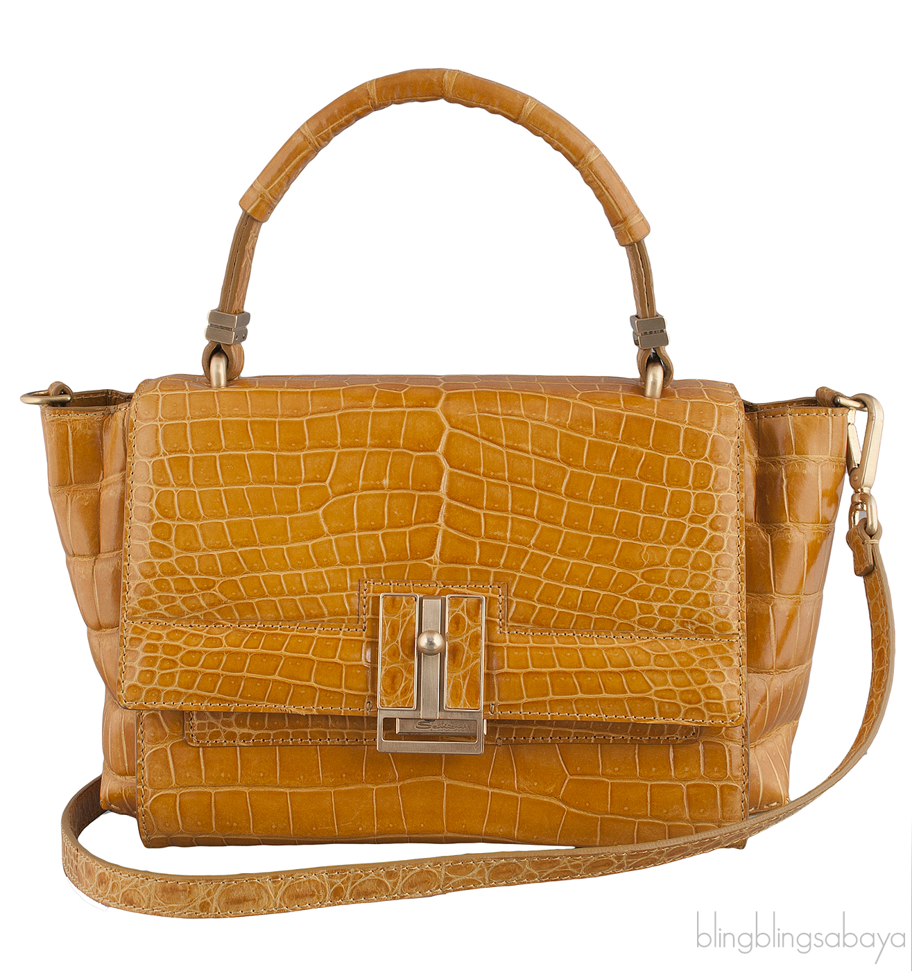 This Camel Brown Crocodile Handbag from Santoni is crafted from crocodile skin accented with the matte gold hardware in camel brown hue. This bag features a flap cover with push-lock closure, single top flat handle and has detachable shoulder strap.