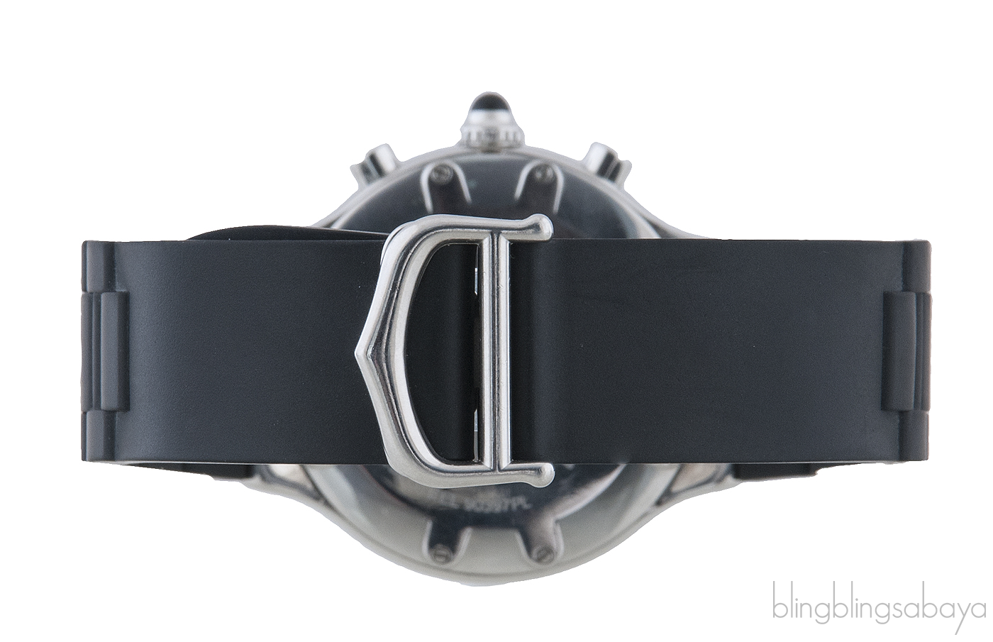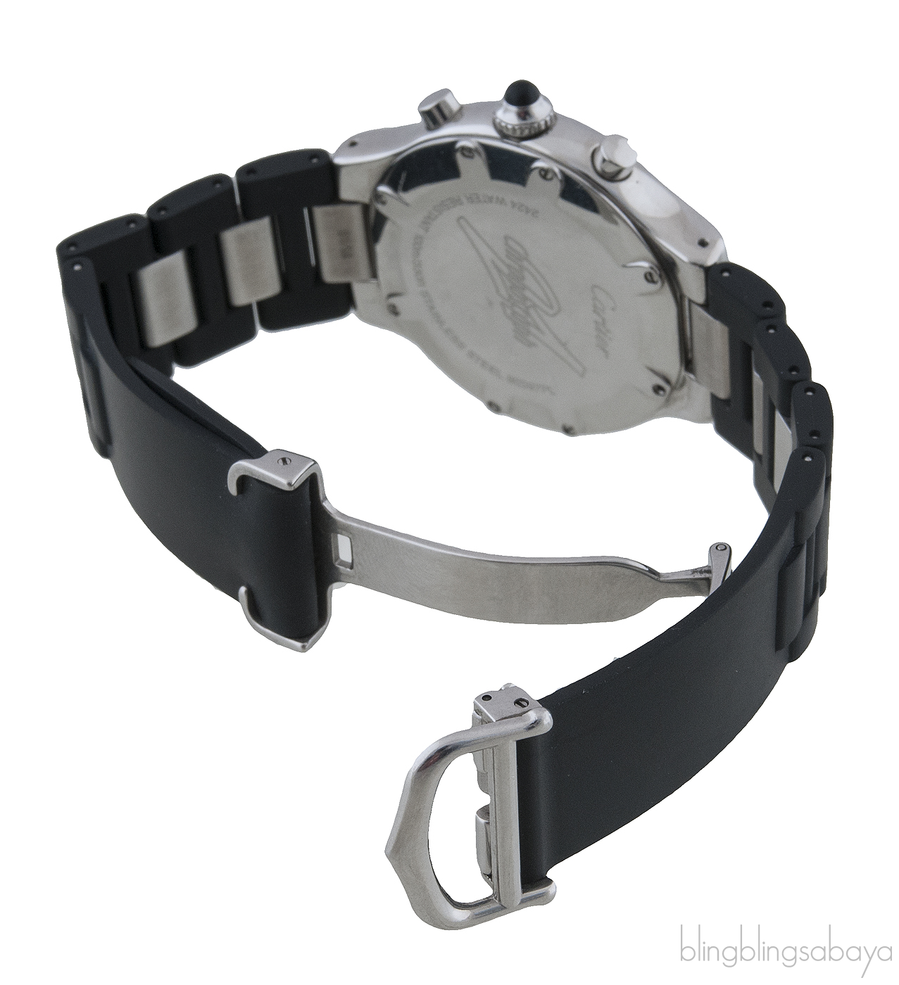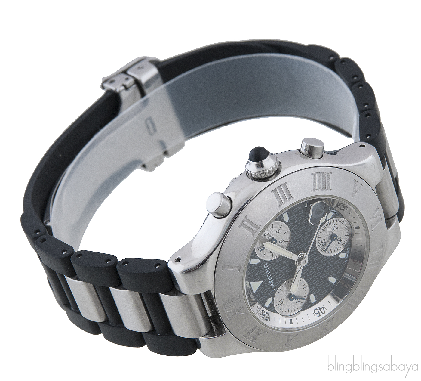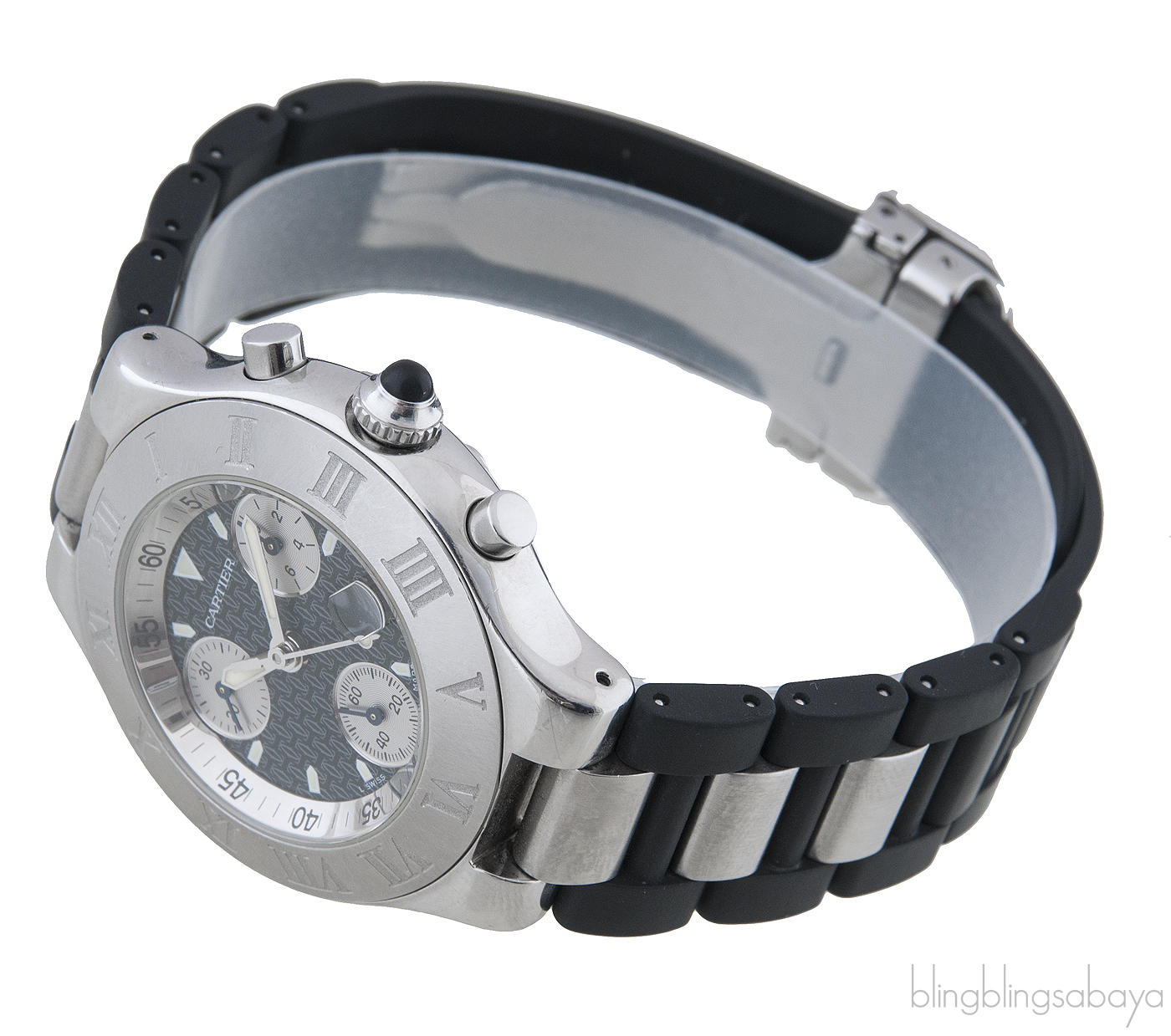 This Cartier 21 Chronoscaph Ladies Watch is crafted in stainless steel case with a black rubber strap with stainless steel links. This watch is fixed with stainless steel bezel engraved with Roman numerals. Black dial with luminous hands and index hour markers. Minute markers on outer rim. Magnified date display at the 4 o'clock position. Chronograph - three silver sub-dials displaying 60 seconds, 30 minutes and 1/10th of a second. Quartz chronograph movement., scratch resistant sapphire crystal and black rubber crown set with cabochon.